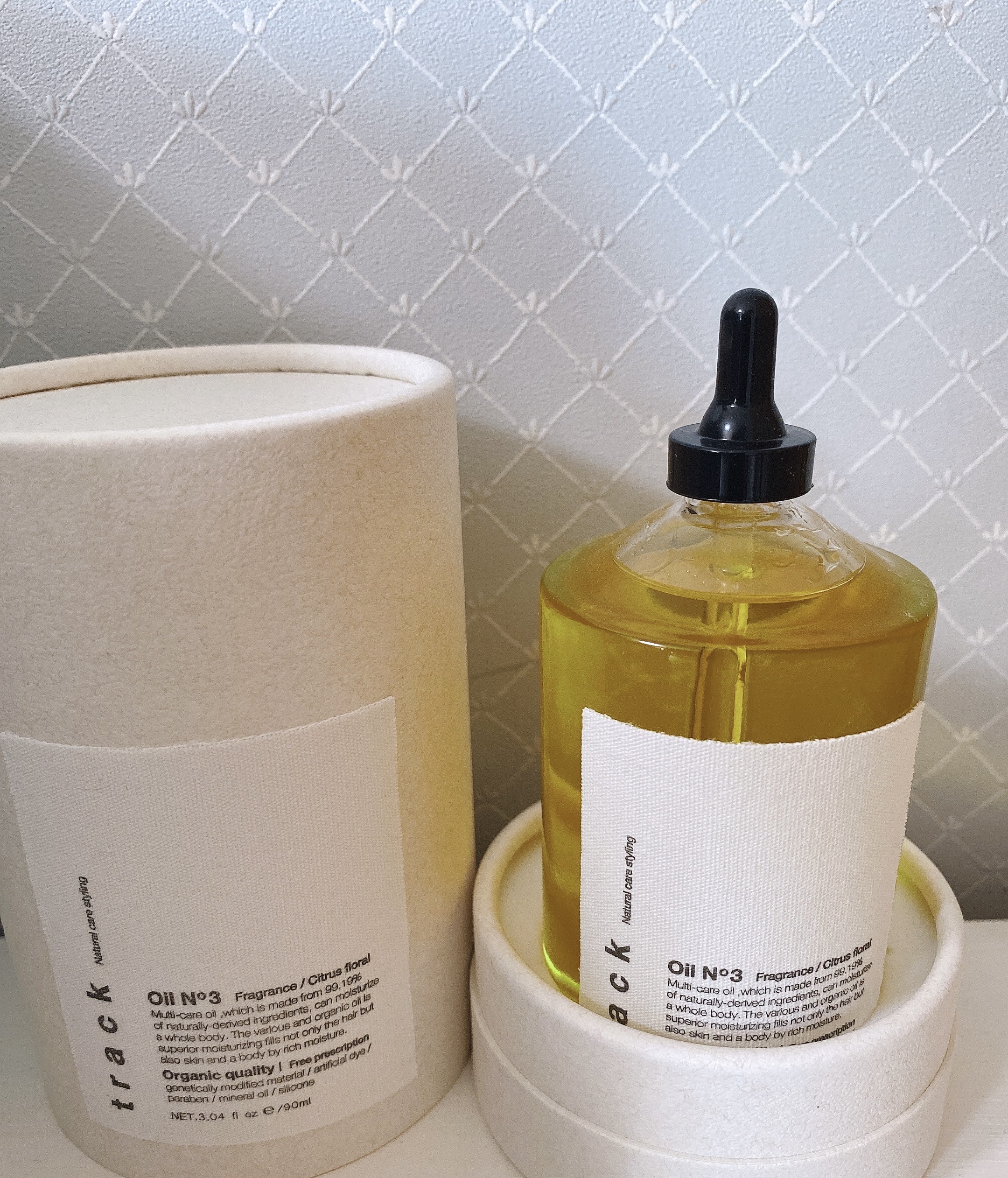 - ■track oil No1(天然由来成分100%)フレッシュシトラスの香り 優しいツヤとうるおいで上品な素髪感を ■track oil No2(天然由来成分99.2%)シトラスハーブの香り 凛としたツヤとみずみずしさで端正な印象を ■track oil No3(天然由来成分99.19%)シトラスフローラルの香り 息づくツヤと深いうるおいでまとまりある表情を