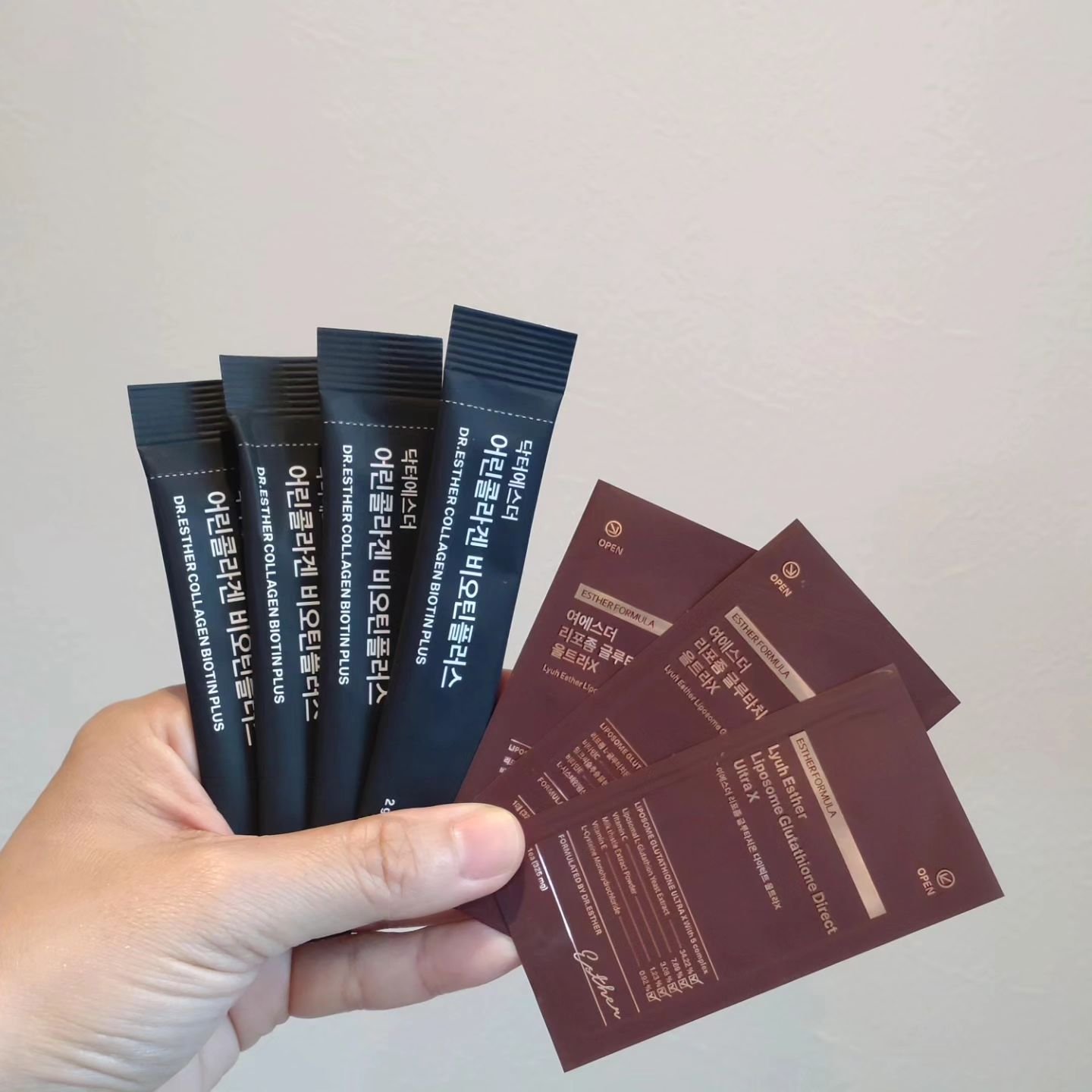 - 機能性原料フィッシュコラーゲン3,2700㎎にフランス産ビオチン4,000%とヨ・エスター博士が直接選んだ二つのビタミンを配合しました。