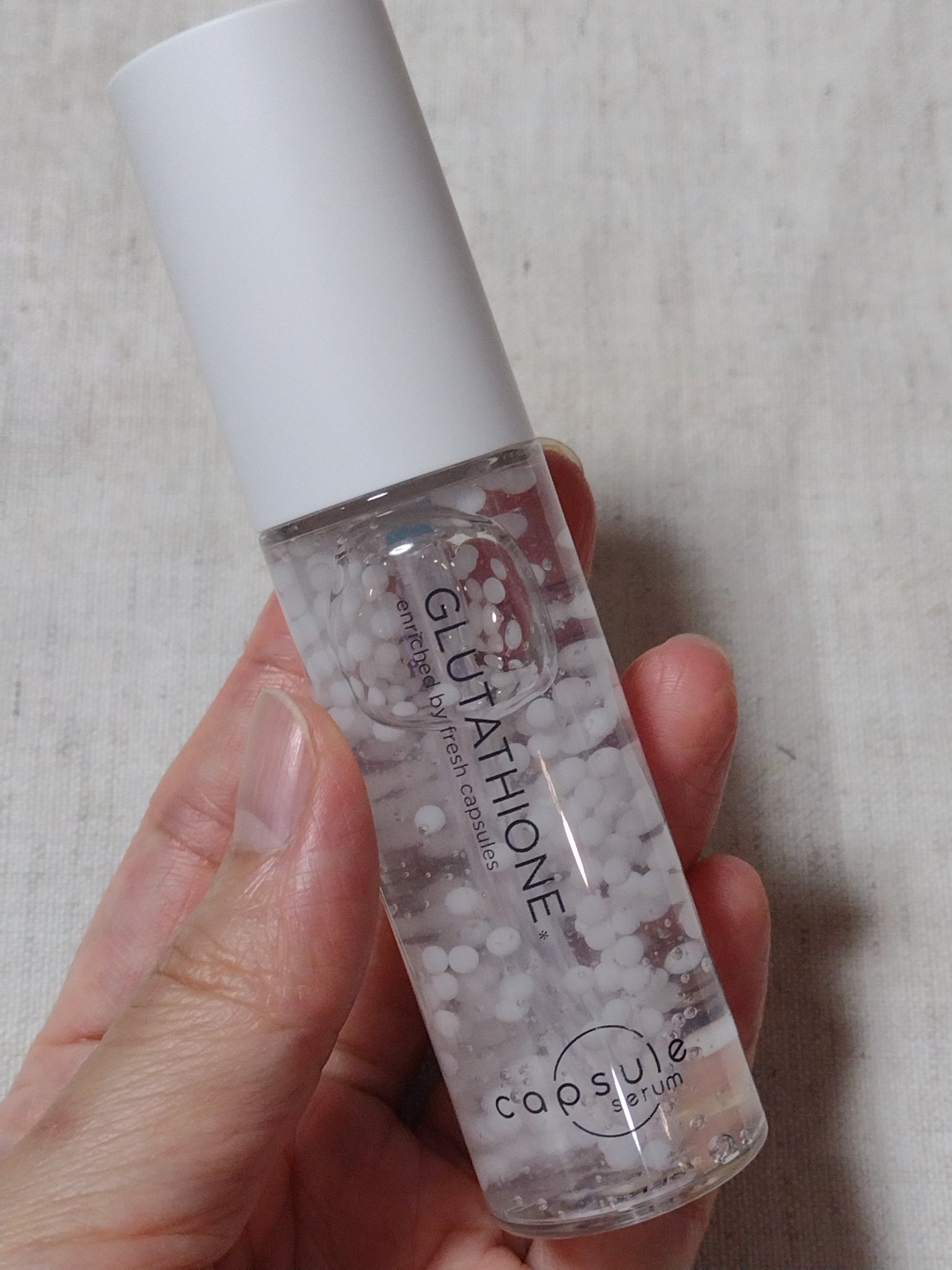 - ①はじける白玉!注目の"グルタチオン"*1をカプセルに厳選配合 ②新鮮なグルタチオンが肌に浸透*2 ③グルタチオン×2種のビタミンC誘導体*3が総合的にアプローチ ④コラーゲン、ヒアルロン酸、3種類のセラミド、ナイアシンアミド、ツボクサエキス(CICA)、フラーレン等11種類の整肌成分を同時に配合 ⑤肌なじみのよい使い心地 ⑤毛穴*4、ざらつき*5、くすみ*5・透明感5、キメ・ツヤもコレ1つで。4in1美容液。 はじけて生まれる生美容液。-独自カプセルが、成分本来のチカラをサポートするこだわりの美容液- *1グルタチオン(皮膚コンディショニング剤) *2角質層まで *3パルミチン酸アスコルビルリン酸3Na、3-グリセリルアスコルビン酸(酸化防止剤) *4乾燥による毛穴の開き *5乾燥による