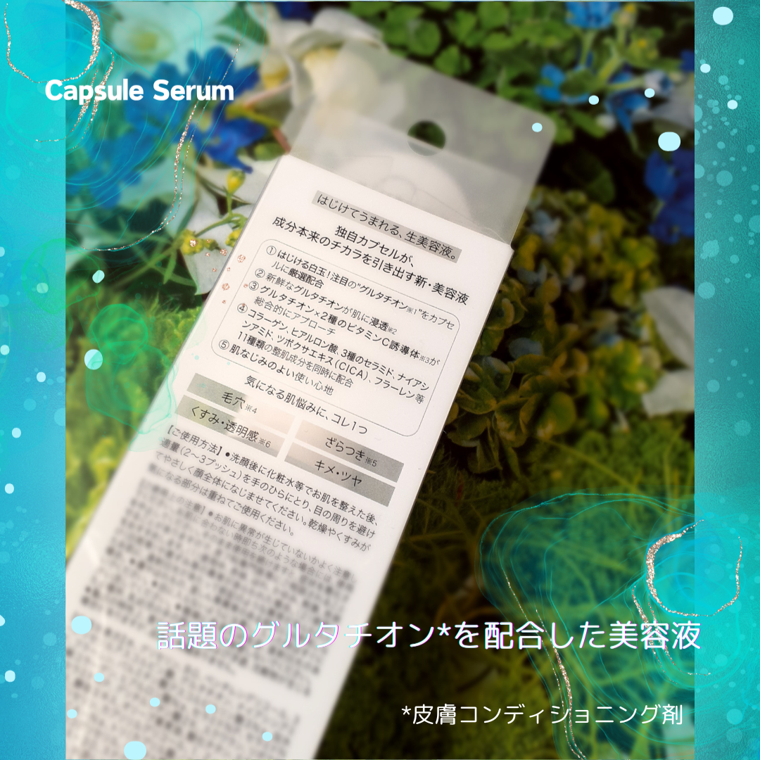 - ①はじける白玉!注目の"グルタチオン"*1をカプセルに厳選配合 ②新鮮なグルタチオンが肌に浸透*2 ③グルタチオン×2種のビタミンC誘導体*3が総合的にアプローチ ④コラーゲン、ヒアルロン酸、3種類のセラミド、ナイアシンアミド、ツボクサエキス(CICA)、フラーレン等11種類の整肌成分を同時に配合 ⑤肌なじみのよい使い心地 ⑤毛穴*4、ざらつき*5、くすみ*5・透明感5、キメ・ツヤもコレ1つで。4in1美容液。 はじけて生まれる生美容液。-独自カプセルが、成分本来のチカラをサポートするこだわりの美容液- *1グルタチオン(皮膚コンディショニング剤) *2角質層まで *3パルミチン酸アスコルビルリン酸3Na、3-グリセリルアスコルビン酸(酸化防止剤) *4乾燥による毛穴の開き *5乾燥による