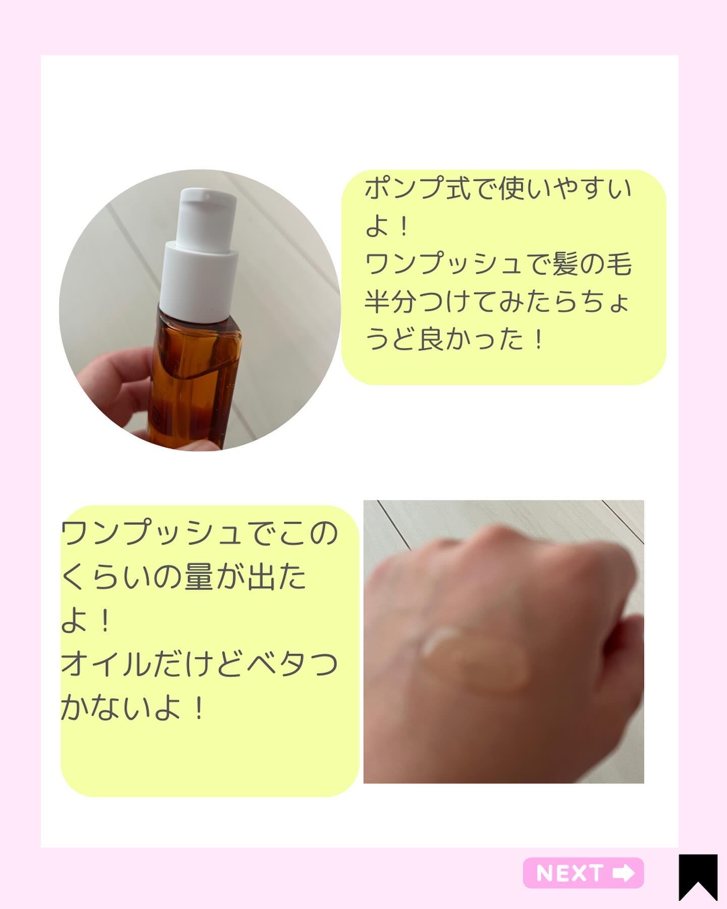 | ドライヤーで乾かすと サラサラしっとりのまとまった髪になって良い感じです💖さすが評価が高いだけあるヘアオイルです | 詳細を見る | ||