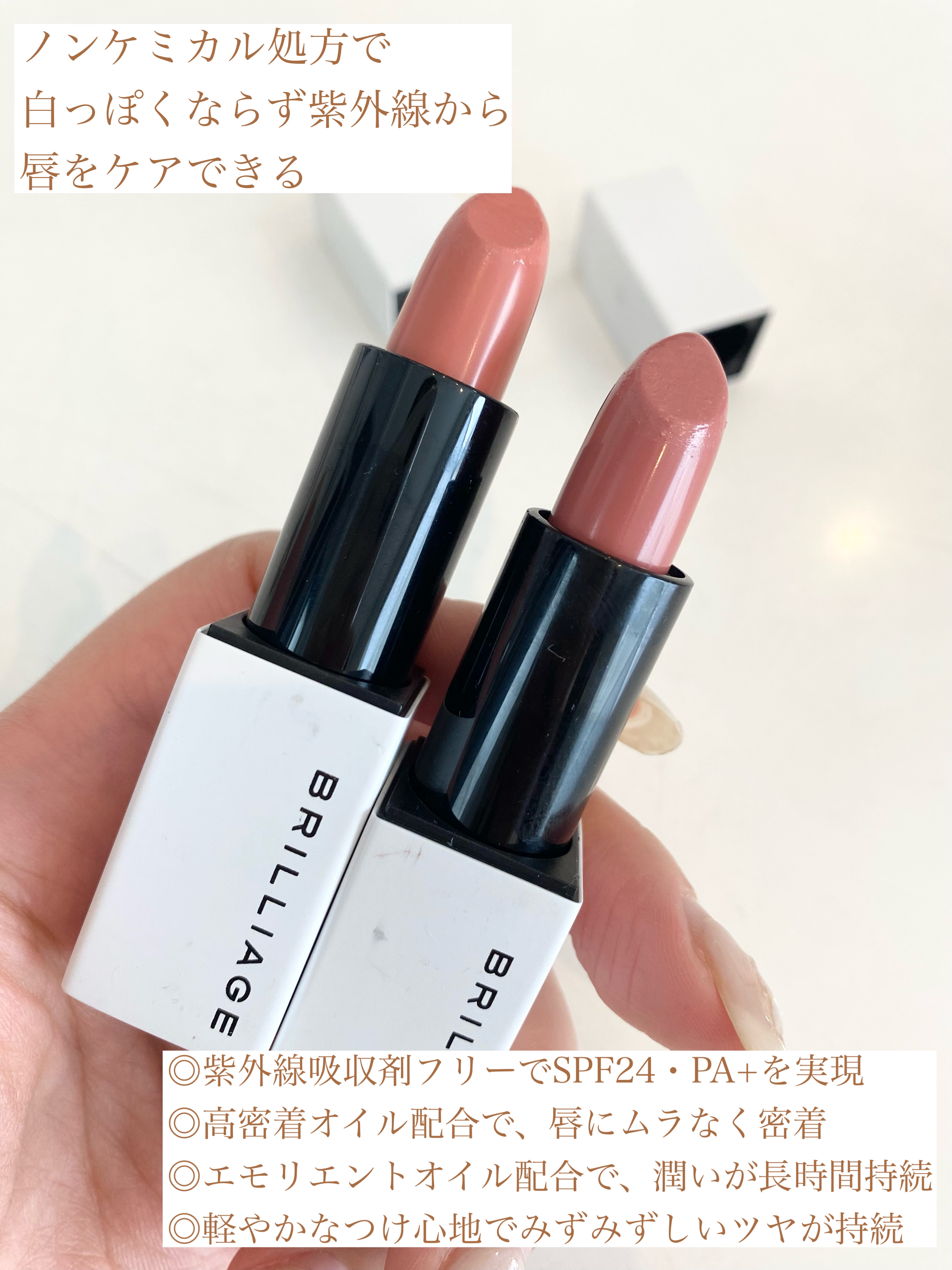 - マスクをはずした瞬間もキレイが叶う!ひと塗りで肌色がワントーンあがる血色カラー ブリリアージュの新色リップは、ポーチに1本しのばせておきたい万能カラー。 ノンケミカル処方に加えて、日常の紫外線もカット。肌映えとケアの両方を実現
