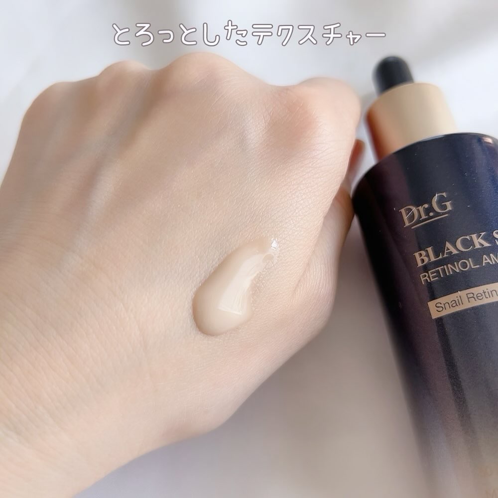 - ブラックスネイル*とレチノール*を配合した、若々しい肌印象に導く美容液です。 Dr.Gのレチノールは独自の成分である、ブラックスネイルレチノール*を使っています! 肌に高い保湿感を与え、肌のキメを整え、弾力やハリのケアを助けるだけでなく、肌の乾燥くすみをケアし、明るい印象のぷるんっとハリのある肌に導きます。 *整肌成分