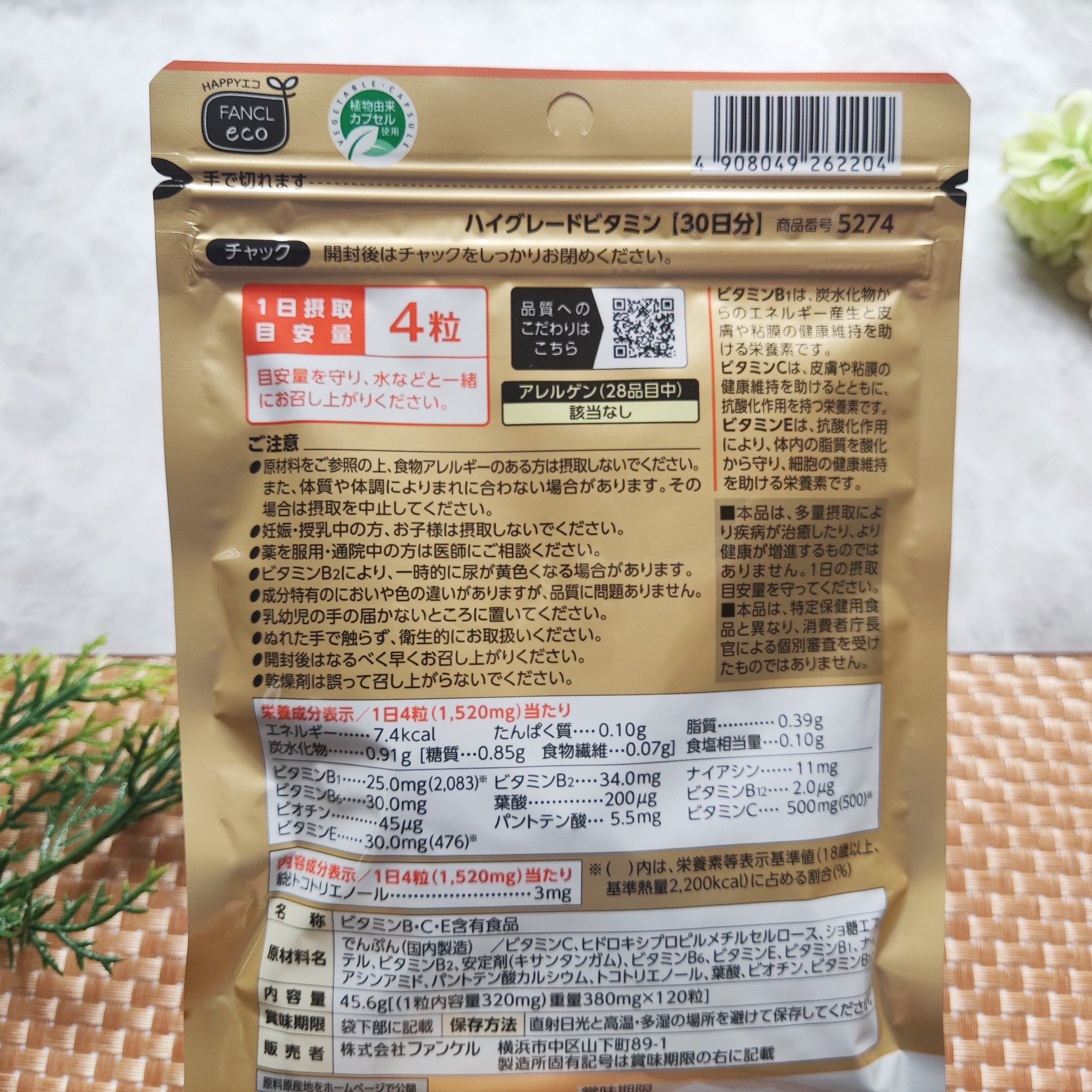 - <【新パッケージ】120粒(30日分)> ビタミンB1:25mg、ビタミンB2:34mg、ナイアシン:11mg、ビタミンB6:30mg、葉酸:200μg、ビタミンB12:2μg、ビオチン:45μg、パントテン酸:5.5mg、ビタミンC:500mg、ビタミンE:30mg、総トコトリエノール:3mg