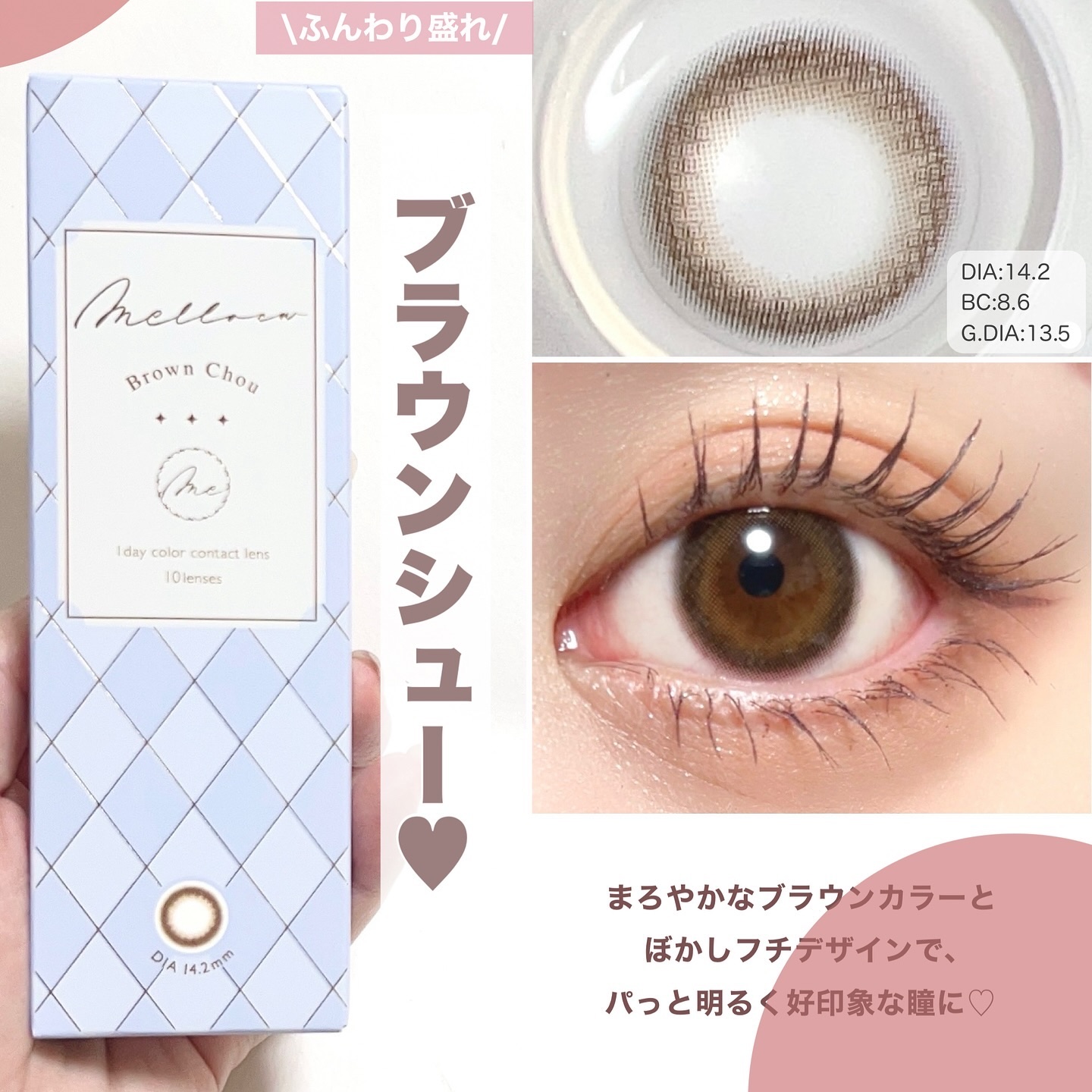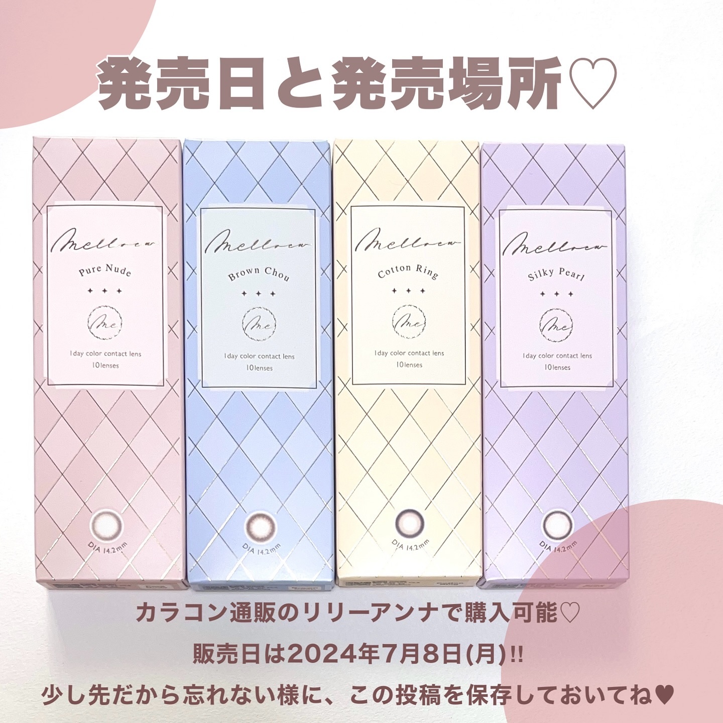 - ※2025年6月以降、商品パッケージ裏面・側面の一部表記を順次変更いたします。尚、これにかかる商品の交換・返品は承っておりません。 ふわっと漂う多幸感 キラキラとした瞳 そんな多くの人が憧れる印象はmelloewで作れる! 王道盛れからあざと盛れまでどんな盛れも叶うラインナップで瞳をコーディネート☆ Cotton Ring(コットンリング) DIA14.2㎜/着色直径13.5㎜ 溶け込みベージュ×くっきりフチ 写真でもリアルでも盛れちゃう♪ Silky Pearl(シルキーパール) DIA14.2㎜/着色直径13.5㎜ ツヤっぽベージュ×細フチ 垢抜けた印象にしたい方におすすめ♪ Truffle Gray(トリュフグレー) DIA14.2㎜/着色直径13.4㎜ おしゃれモテ♡ 濃いめグレージュ×ぼかし細フチ 品よく盛れるお嬢様な瞳に Pure Nude(ピュアヌード) DIA14.2㎜/着色直径13.2㎜ 絶妙ヌーディカラー×グラデフチ お仕事やカラコン初心者にもおすすめ♪ Brown Chou(ブラウンシュー) DIA14.2㎜/着色直径13.6㎜ まろやかブラウン×ぼかしフチ 日常使いにもおすすめ♪ Mocha Powder(モカパウダー) DIA14.2㎜/着色直径13.6㎜ リピ確モテ♡ ふわふわモカ×くりっとフチ 絶対盛れちゃう甘い瞳に Love Cacao(ラブカカオ) DIA14.2㎜/着色直径13.0㎜ 清楚モテ♡ とろふわチョコレート×こっそりフチ バレずに盛れちゃう瞳に カラーコンタクトレンズの不適正使用による眼障害の危険性等などがあります。 ●コンタクトレンズは高度管理医療機器です。不十分な洗浄・消毒など不適切なケアや、長時間・交換期間を超えた装用により、アレルギー性結膜炎、角膜感染症、角膜潰瘍等の重篤な眼障害が発生する危険性があります ●ご使用前に取扱説明書を確認してください 使用上の留意事項 ●眼科医院等を受診してからお求めください ●眼に異常を感じたら直ちにレンズ使用を中止し、お近くの眼科等で診察を受けてください ●医師の指示にしたがってご使用ください ●コンタクトレンズを装用する場合、自覚症状がなくても、眼科医院等での定期検査を受けてください ●レンズに不具合がある場合は使用しないでください