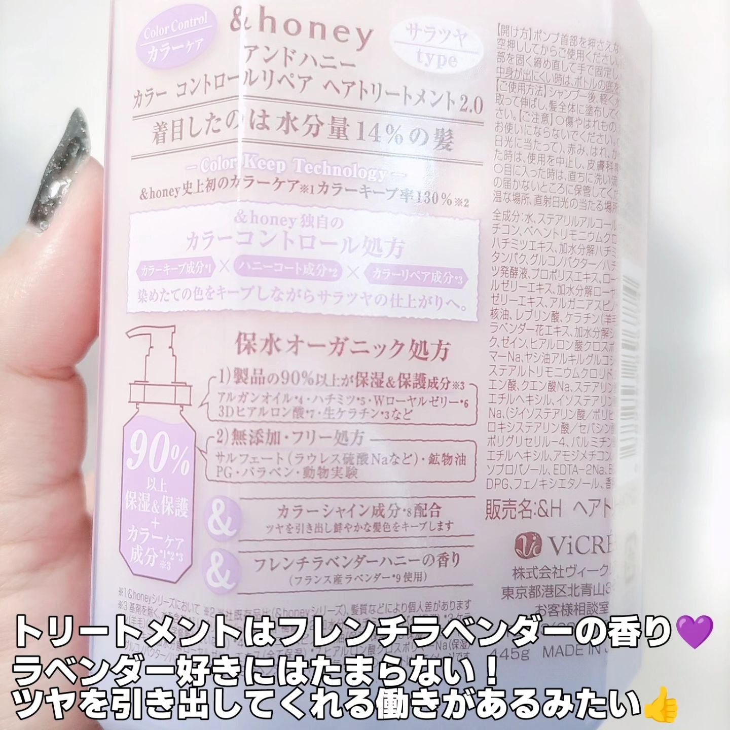 - 鮮やかな髪色をキープしながら、サラツヤの仕上がりへ導くハチミツ美容のカラーケアシャンプー。 製品の90%以上をハチミツ*1やレブリン酸*2などの保湿&保護+カラーケア成分で構成しました。※1 さらにハチミツ美容とカラーケア成分*2*3*4の融合により、鮮やかな髪色をキープしながらキューティクルケアを叶えます。 &honey独自のカラーコントロール処方で、カラーキープ率130%の髪へ※2。 ケラチン由来の洗浄成分*5の配合により、染めたての髪色をキープしながらツヤめく洗い上がりです。 無添加フリー処方です。※3。 フランス産スズランエキス*6を使用した、ミュゲハニーの香りです。 サラツヤタイプ ※1 基剤を除く、水を含む ※2 当社既存品比(&honeyシリーズ比)、髪質などにより個人差があります ※3 サルフェート、パラベン、PG、鉱物油、動物実験 *1 保湿 *2 レブリン酸(pH調整剤・補修) *3 加水分解ハチミツタンパク(保護) *4 ケラチン(羊毛)(補修・化学修飾していない) *5 ココイル加水分解ケラチンK(羊毛) *6 スズランエキス(香気・保湿)