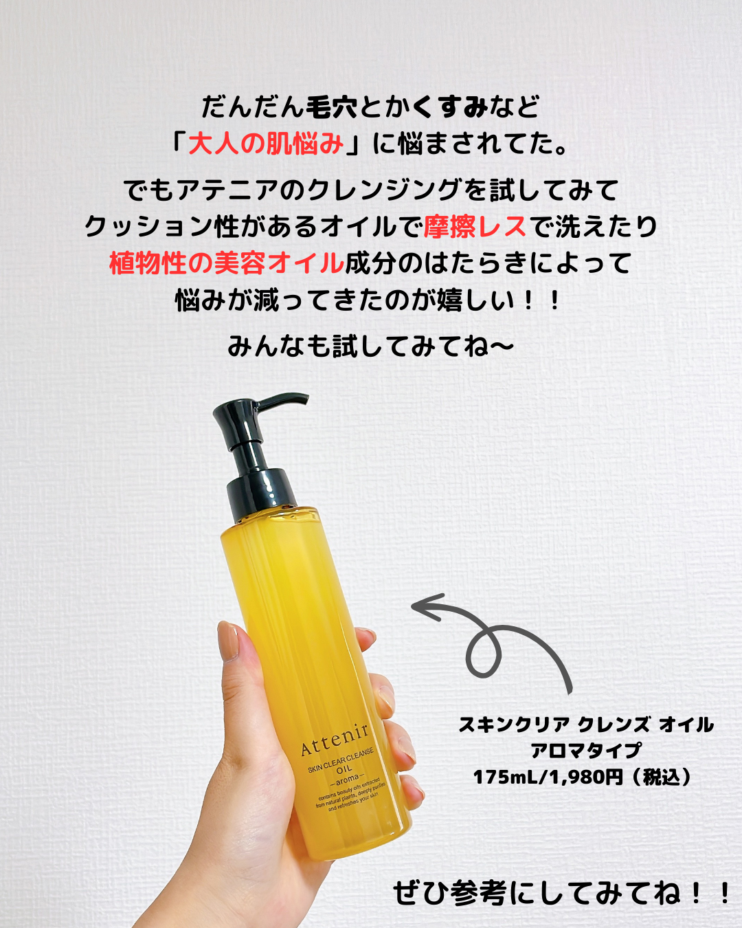 #PR#アテニア大人気のアテニアのクレンジングオイル🤍 ☑︎アテニアスキンクリアクレンズオイルアロマタイプ自然由来の美容オイルを厳選配合したオイルクレンジングです✨クレンジングでくすみケア(年齢による古い角質の蓄積で肌がくすんで見える様子のこ...