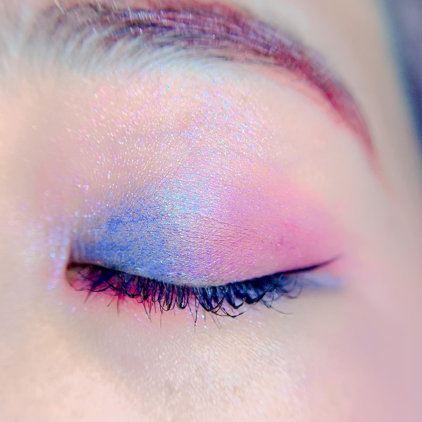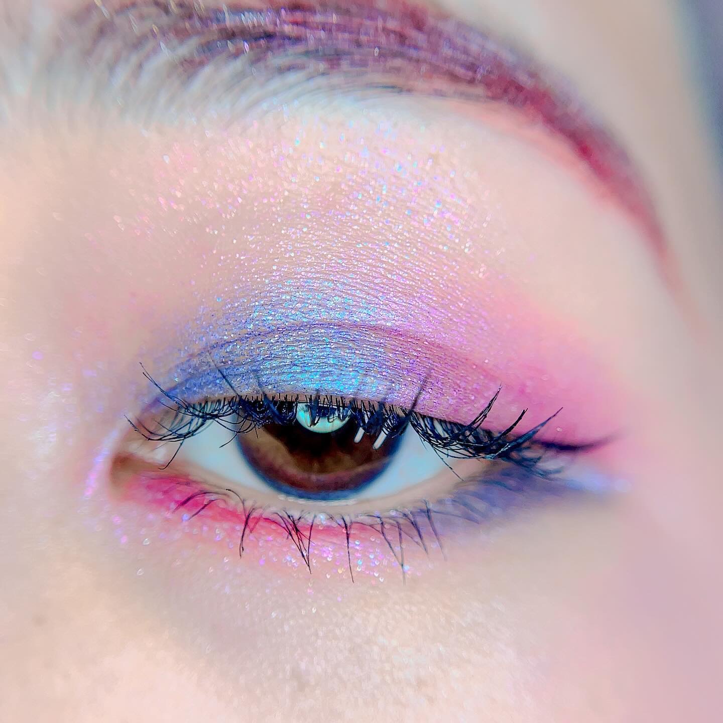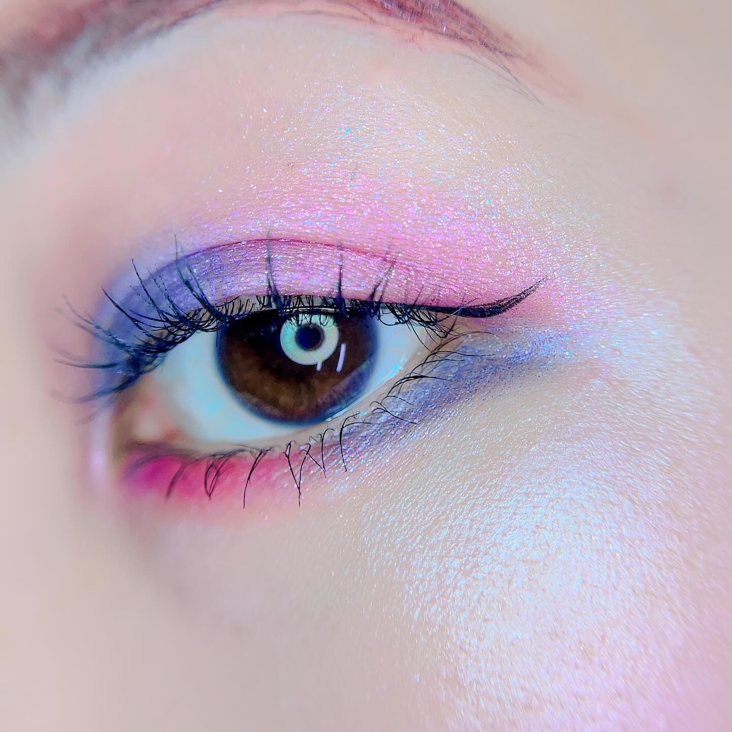 ベースに右上、目頭から黒目上に真ん中、黒目〜目尻に右下を、左上を目頭にくの字に塗ってもらいました✨ ピンクサクラよりもクールな感じで、目で見た色より私の肌では紫っぽく発色しました😍 上2つはラメはぎっしりでときめく💓 ブラウンメイクがとても苦手だけれどこれならブラウンメイク出来そう👌(かなり紫寄りですが) くすみ感は強いので苦手な方は厳しいかも…(特に真ん中) クールな印象になるので大人顔さん向けor大人顔になりたい方向けのイメージです✨