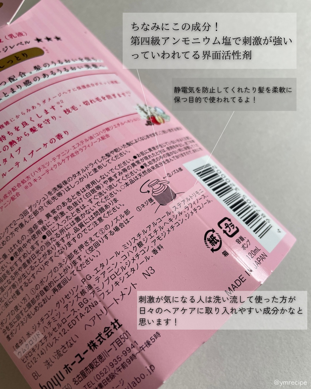 - <本体(120ml)> 水、ジメチコン、グリセリン、PG、エタノール、ミリスチルアルコール、ステアルトリモニウムクロリド、ハチミツ、アンズ核油、テアニン、コハク酸ジエチルヘキシル、ラフィノース、ヒドロキシエチルセルロース、BG、アミノプロピルジメチコン、アモジメチコン、ジメチコノール、(C12-14)パレス-12、EDTA-2Na、フェノキシエタノール、香料 <詰め替え用(110ml)> 水、ジメチコン、グリセリン、PG、エタノール、ミリスチルアルコール、ステアルトリモニウムクロリド、ハチミツ、アンズ核油、テアニン、コハク酸ジエチルヘキシル、ラフィノース、ヒドロキシエチルセルロース、BG、アミノプロピルジメチコン、アモジメチコン、ジメチコノール、(C12-14)パレス-12、EDTA-2Na、フェノキシエタノール、香料