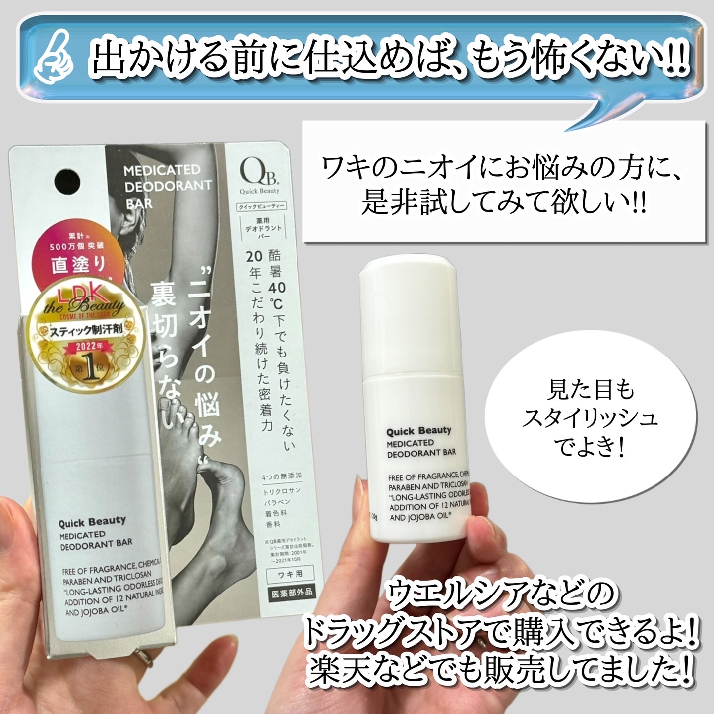 #PR#クイックビューティー@liberta_itemさまからいただきましたクイックビューティー薬用デオドラントバー表面サラサラ、ベタつき香り無くて◎夏本番はクセがないものが使いやすい🥹✨密着力が高く、汗・水・こすれ*に強く手を汚さず使えるス...