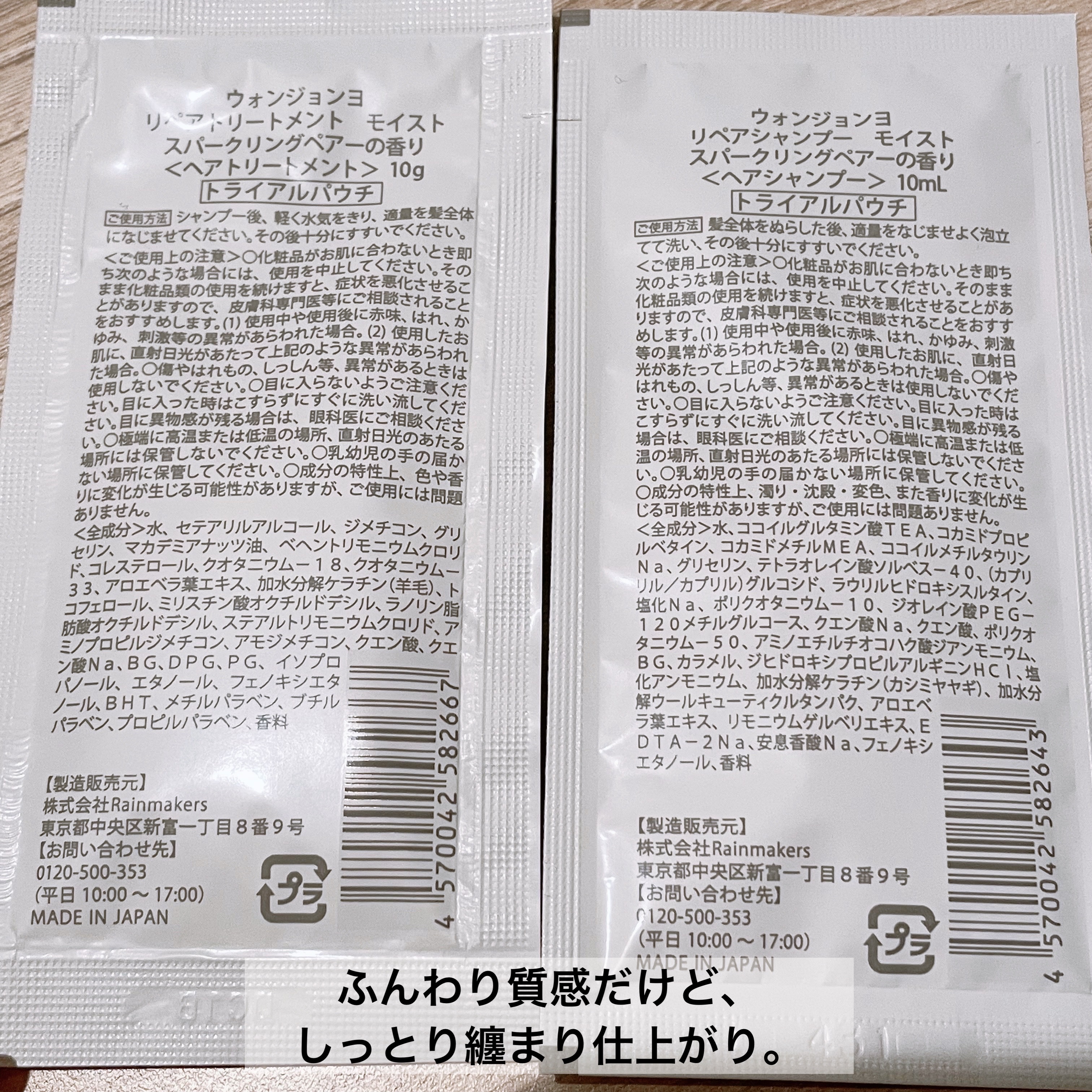 - <リペアシャンプー モイスト> 水、ココイルグルタミン酸TEA、コカミドプロピルベタイン、コカミドメチルMEA、ココイルメチルタウリンNa、グリセリン、テトラオレイン酸ソルベス-40、(カプリリル/カプリル)グルコシド、ラウリルヒドロキシスルタイン、塩化Na、ポリクオタニウム-10、ジオレイン酸PEG-120メチルグルコース、クエン酸Na、クエン酸、ポリクオタニウム-50、アミノエチルチオコハク酸ジアンモニウム、BG、カラメル、ジヒドロキシプロピルアルギニンHCl、塩化アンモニウム、加水分解ケラチン(カシミヤヤギ)、加水分解ウールキューティクルタンパク、アロエベラ葉エキス、リモニウムゲルベリエキス、EDTA-2Na、安息香酸Na、フェノキシエタノール、香料 <リペアトリートメント モイスト> 水、セテアリルアルコール、ジメチコン、グリセリン、マカデミアナッツ油、ベヘントリモニウムクロリド、コレステロール、クオタニウム-18、クオタニウム-33、アロエベラ葉エキス、加水分解ケラチン(羊毛)、トコフェロール、ミリスチン酸オクチルドデシル、ラノリン脂肪酸オクチルドデシル、ステアルトリモニウムクロリド、アミノプロピルジメチコン、アモジメチコン、クエン酸、クエン酸Na、BG、DPG、PG、イソプロパノール、エタノール、フェノキシエタノール、BHT、メチルパラベン、ブチルパラベン、プロピルパラベン、香料 <シャンプー 詰め替え用> 水、ココイルグルタミン酸TEA、コカミドプロピルベタイン、コカミドメチルMEA、ココイルメチルタウリンNa、グリセリン、テトラオレイン酸ソルベス-40、(カプリリル/カプリル)グルコシド、ラウリルヒドロキシスルタイン、塩化Na、ポリクオタニウム-10、ジオレイン酸PEG-120メチルグルコース、クエン酸Na、クエン酸、ポリクオタニウム-50、アミノエチルチオコハク酸ジアンモニウム、BG、カラメル、ジヒドロキシプロピルアルギニンHCl、塩化アンモニウム、加水分解ケラチン(カシミヤヤギ)、加水分解ウールキューティクルタンパク、アロエベラ葉エキス、リモニウムゲルベリエキス、EDTA-2Na、安息香酸Na、フェノキシエタノール、香料 <トリートメント パウチ 10ml> 水、セテアリルアルコール、ジメチコン、グリセリン、マカデミアナッツ油、ベヘントリモニウムクロリド、コレステロール、クオタニウム-18、クオタニウム-33、アロエベラ葉エキス、加水分解ケラチン(羊毛)、トコフェロール、ミリスチン酸オクチルドデシル、ラノリン脂肪酸オクチルドデシル、ステアルトリモニウムクロリド、アミノプロピルジメチコン、アモジメチコン、クエン酸、クエン酸Na、BG、DPG、PG、イソプロパノール、エタノール、フェノキシエタノール、BHT、メチルパラベン、ブチルパラベン、プロピルパラベン、香料