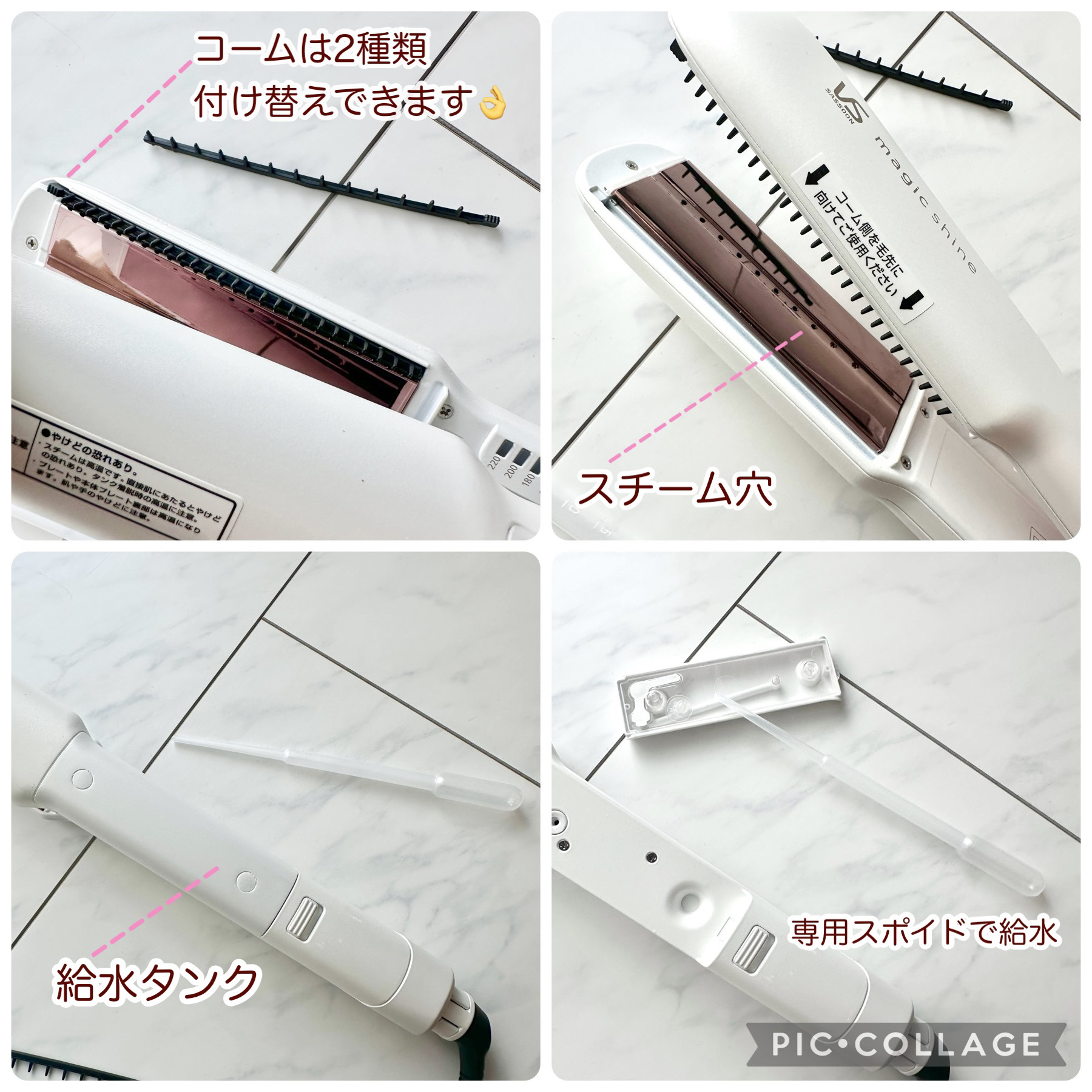 - ■特長 ・ヴィダルサスーン史上最大スチーム量(※1)でうるツヤストレートへ。 ・シャイニーミラーコーティング採用。しなやかでツヤのある髪へ導く。 ・最高温度約220℃の高温設定。約140~220℃までの5段階温度調節可能。(※2) ・大量の高温スチームで、ストレートが24時間続きます。(※3) (※1)当社調べ、2023年9月時点 (※2)周囲温度30℃の場合 (※3)【試験方法】うねりのある毛髪を選別し、毛束を作成。処理前の毛束全長を測定し、キューティクルの流れにそって毛先方向に4~5秒の速さで5回滑らせた後、24時間後に毛束全長を測定。(第三者機関調べ)〇VSS-9920同等性能品による測定。【測定環境】室温20℃±5℃、相対湿度60%±10%