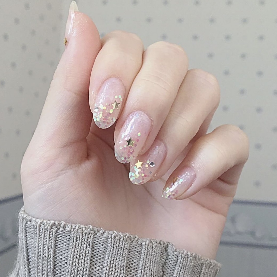 夏ネイルにおすすめ宝石みたいなクリアラメ♡ 淡色カラー、濃いめカラー どちらに重ねても透明感がでて 可愛すぎる仕上がりに🤲🏻 全体に重ねるよりも ポイント使いがぬけ感がでて 垢抜けた印象になると思います🫶🏻