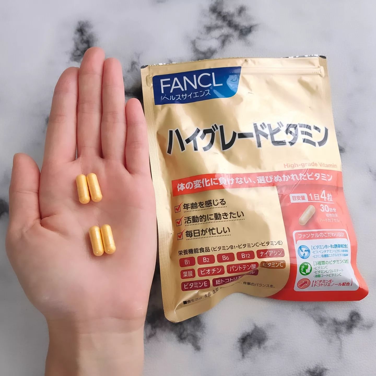 - 年齢による体の変化とうまく付き合うために、中高年のために厳選したこだわりのビタミンです。トリプルビタミンCやビタミンB誘導体、ビタミンEなど、吸収性・持続性が高く、体内での効率を第一に考えたビタミンを複合配合。 効率良くビタミンを摂りたい方におすすめです。 【1日の摂取目安】 4粒 【主要成分/1日4粒当たり】 ビタミンB1:25mg、ビタミンB2:34mg、ナイアシン:11mg、ビタミンB6:30mg、葉酸:200μg、ビタミンB12:2μg、ビオチン:45μg、パントテン酸:5.5mg、ビタミンC:500mg、ビタミンE:30mg、総トコトリエノール:3mg 【栄養機能表示】 ビタミンB1:炭水化物からのエネルギー産生と皮膚や粘膜の健康維持を助ける栄養素です。 ビタミンC:皮膚や粘膜の健康維持を助けるとともに、抗酸化作用を持つ栄養素です。 ビタミンE:抗酸化作用により、体内の脂質を酸化から守り、細胞の健康維持を助ける栄養素です。 【アレルゲン(28品目中)】 該当なし 【ご注意】 ※妊娠・授乳中の方、お子様はお召し上がりにならないでください。 ※本品は、多量摂取により疾病が治癒したり、より健康が増進するものではありません。1日の摂取目安量を守ってください。 ※本品は、特定保健用食品と異なり、消費者庁長官による個別審査を受けたものではありません。 ※本品により尿が黄色くなることがありますが、これはビタミンB2による一時的なものですので心配はありません。