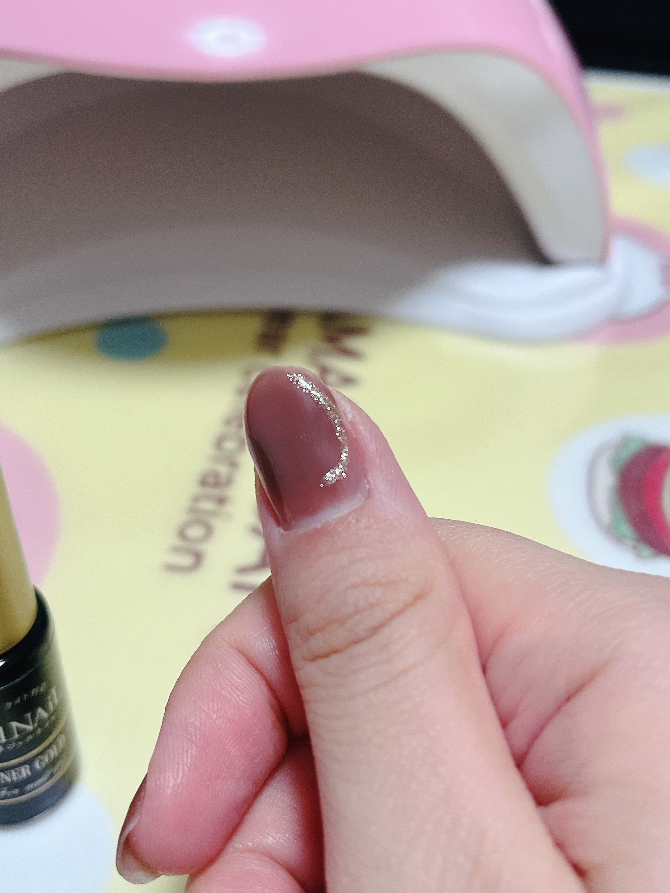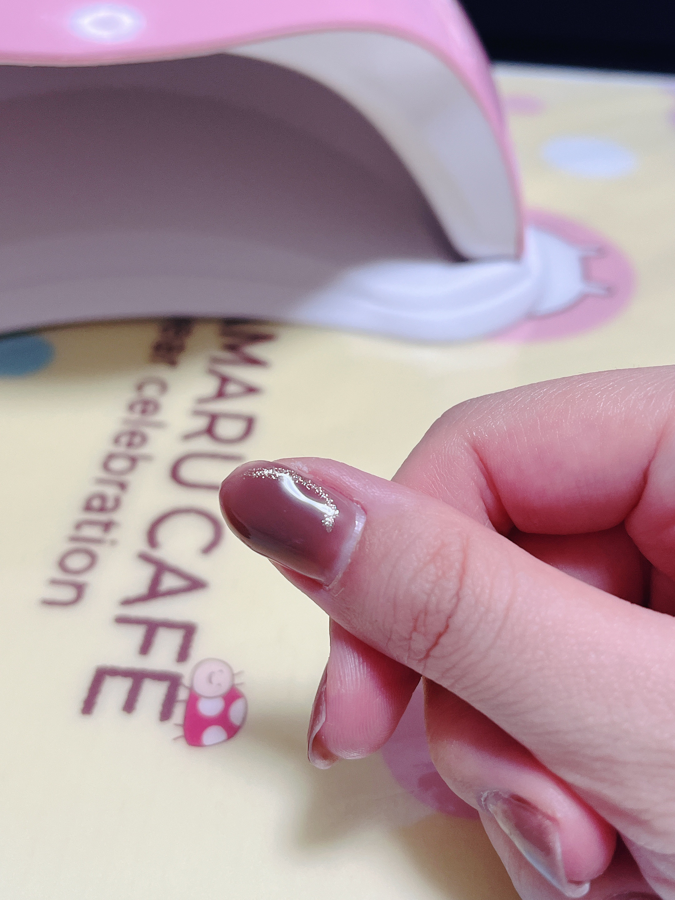 この色すごくおすすめです 薄く塗ると爪のピンク感もありつつ可愛いブラウンになります あまり黄色ぽくないので どちらかというとミューテッド、ブルベ向きのブラウンに感じました ブラシはネイル工房のゼッカブラシ ショートライナーですがロングライナーがある方はそちらの方が線は引きやすいと思います
