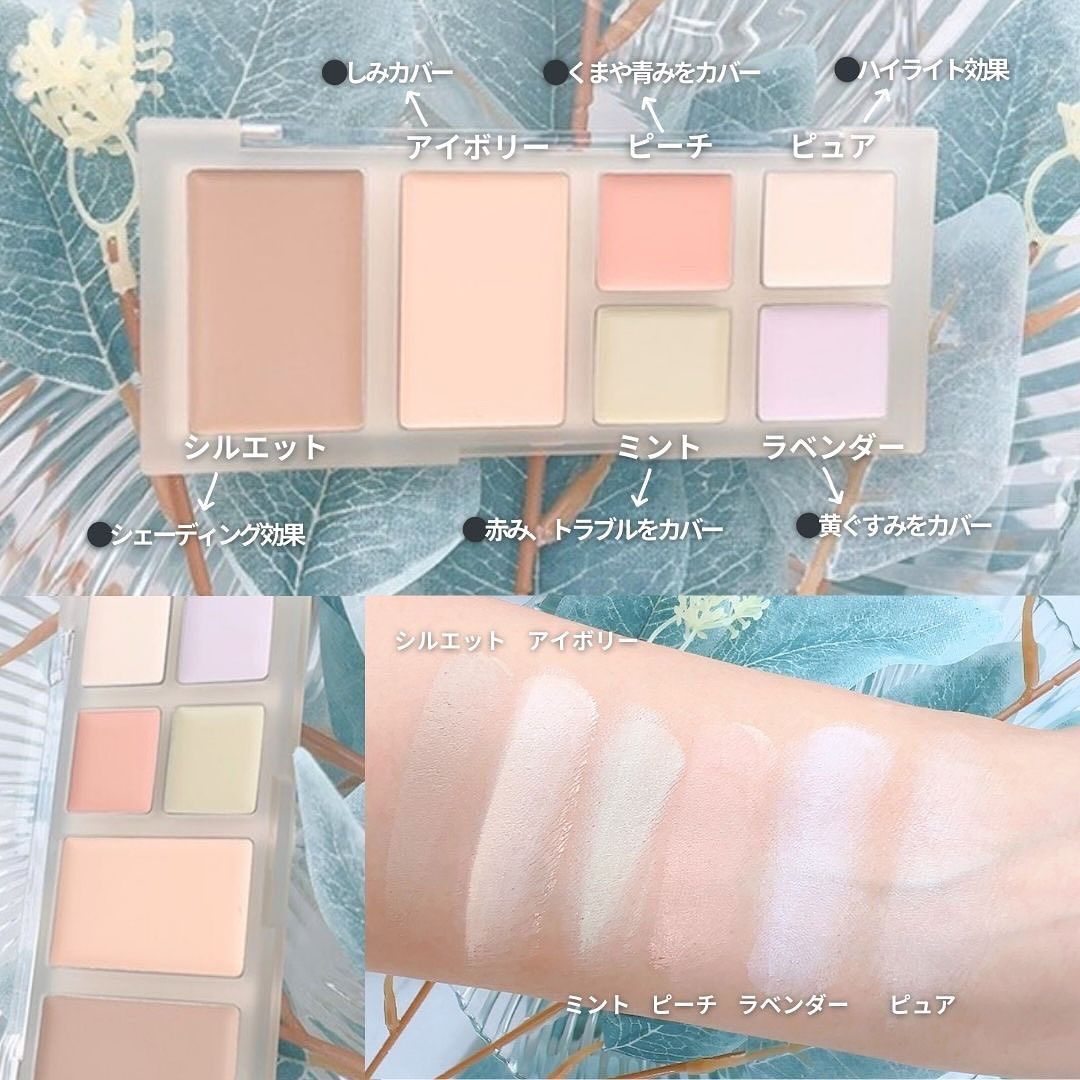 - 6色のカラーが入った、コンシーラーパレットで、コンシーラーとしてだけでなく、シェーディング、ハイライト、トーン調整が可能です。 ピーチ: クマカバーにおすすめ。保湿力が高く、ナチュラルなツヤ感です。 グリーン:ニキビや赤みのカバーにおすすめ。滑らかなテクスチャーで、カバー力が高いです。 パープル: くすみカバーにおすすめ。保湿力が高く、ナチュラルなツヤ感です。 ハイライト: 光の屈折を利用し、自然で柔らかい輝きを与えます。 シェーディング: 自然に影を演出し、しっかりと密着します。 コンシーラー: 滑らかなテクスチャーで、カバー力が高いです。