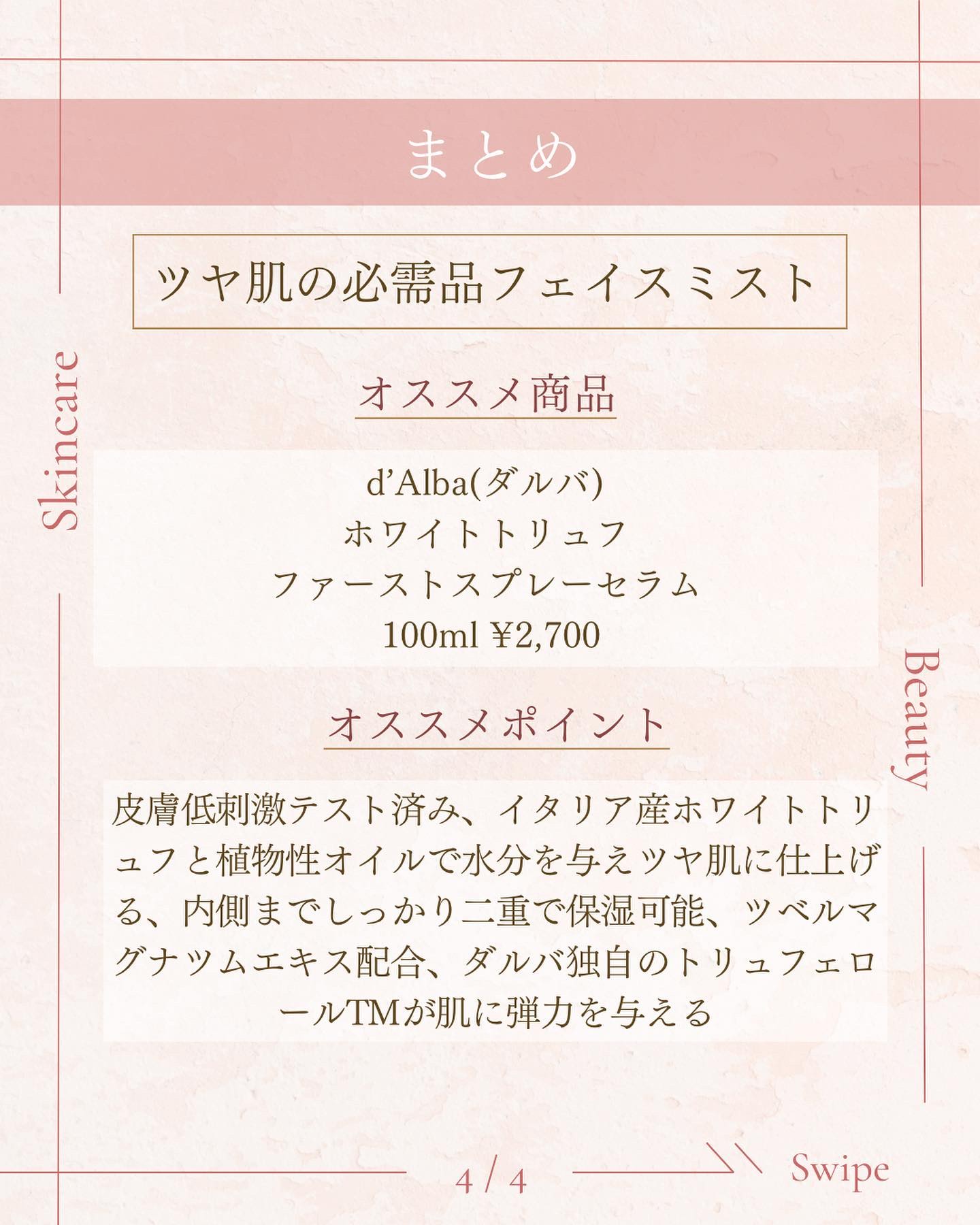 - イタリア産ホワイトトリュフ*と植物性オイルで豊かな水分を与えツヤ肌に仕上げる保湿ケアミストです。肌表面の保湿だけでなく、内側までしっかり二重で保湿可能。さらにダルバ独自のトリュフェロールTMが肌に弾力を与えます。霧のような細かなミストで洗顔後やお風呂上り以外のメイクの上からでもメイクを邪魔することなく使用することができます。 *ツベルマグナツムエキス(保湿成分) イタリアヴィーガン認証V-LABEL取得 皮膚低刺激テスト済み *全ての方に皮膚刺激が発生しないということではありません。 【ご使用方法】 1. 洗顔後、3~5回振って中身が十分に混ざった後、顔全体にまんべんなく噴射して軽くたたいて肌に馴染ませます。 * 鼻や口から吸い込まないように注意してください。 【使用上の注意】 お肌に異常が生じていないかよく注意して使用してください。化粧品がお肌に合わないとき即ち次のような場合には、使用を中止してください。そのまま使用を続けますと、症状を悪化させることがありますので、皮ふ科専門医等にご相談されることをおすすめします。 (1)使用中、赤味、はれ、かゆみ、刺激、色抜け(白斑等)や黒ずみ等の異常があらわれた場合 (2)使用したお肌に、直射日光があたって(1)のような異常があらわれた場合