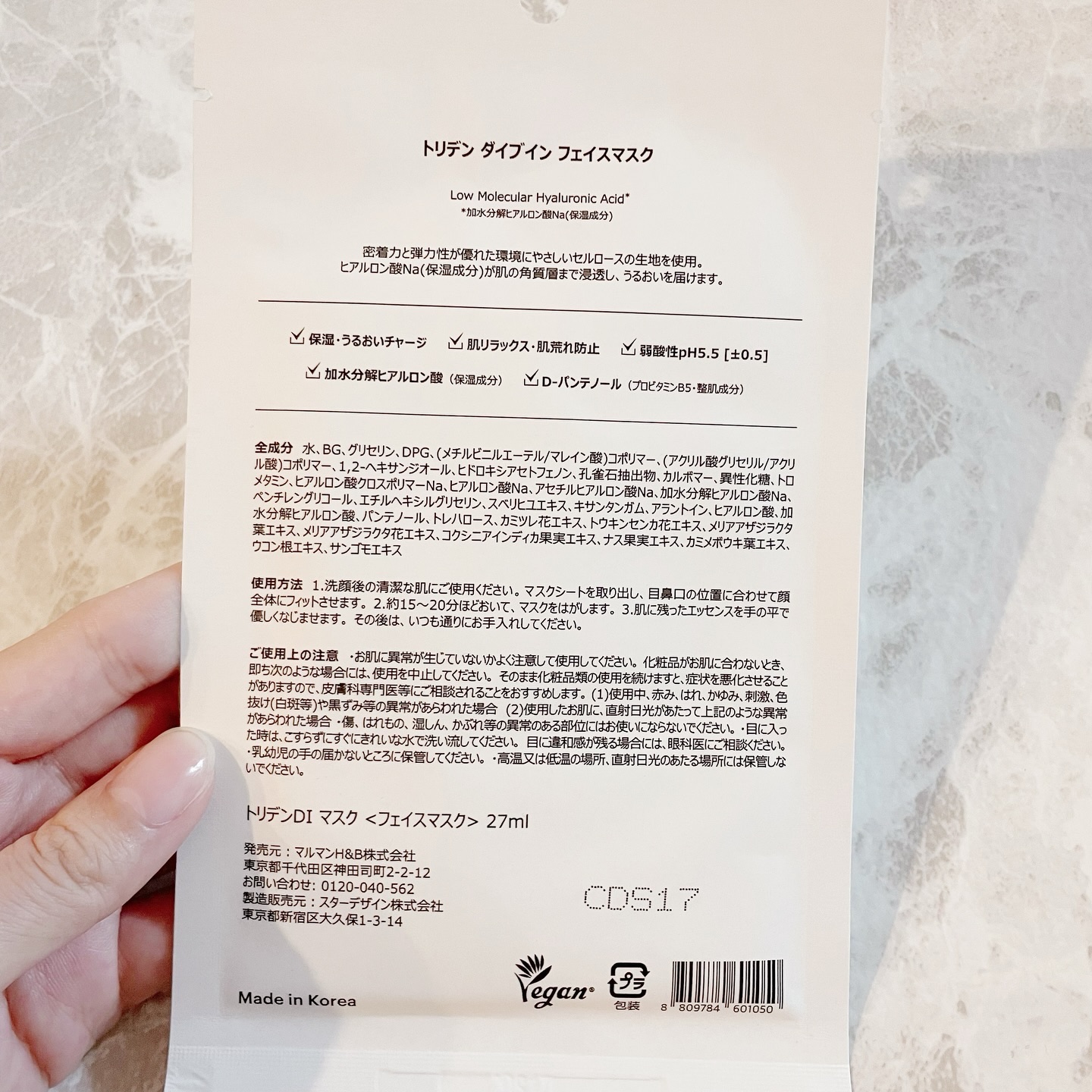 - <1枚> 水、BG、グリセリン、DPG、(メチルビニルエーテル/マレイン酸)コポリマー、(アクリル酸グリセリル/アクリル酸)コポリマー、1,2-ヘキサンジオール、ヒドロキシアセトフェノン、孔雀石抽出物、カルボマー、異性化糖、トロメタミン、ヒアルロン酸クロスポリマーNa、ヒアルロン酸Na、アセチルヒアルロン酸Na、加水分解ヒアルロン酸Na、ペンチレングリコール、エチルヘキシルグリセリン、スベリヒユエキス、キサンタンガム、アラントイン、ヒアルロン酸、加水分解ヒアルロン酸、パンテノール、トレハロース、カミツレ花エキス、トウキンセンカ花エキス、メリアアザジラクタ葉エキス、メリアアザジラクタ花エキス、コクシニアインディカ果実エキス、ナス果実エキス、カミメボウキ葉エキス、ウコン根エキス、サンゴモエキス <3枚> 水、BG、グリセリン、DPG、(メチルビニルエーテル/マレイン酸)コポリマー、(アクリル酸グリセリル/アクリル酸)コポリマー、1,2-ヘキサンジオール、ヒドロキシアセトフェノン、乳雀石抽出物、カルボマー、異性化糖、トロメタミン、ヒアルロン酸クロスポリマーNa、ヒアルロン酸Na、アセチルヒアルロン酸Na、加水分解ヒアルロン酸Na、ペンチレングリコール、エチルヘキシルグリセリン、スベリヒユエキス、キサンタンガム、アラントイン、ヒアルロン酸、加水分解ヒアルロン酸、パンテノール、トレハロース、カミツレ花エキス、トウキンセンカ花エキス、メリアアザジラクタ葉エキス、メリアアザジラクタ花エキス、コクシニアインディカ果実エキス、ナス果実エキス、カミメボウキ葉エキス、ウコン根エキス、サンゴモエキス <10枚> 水、BG、グリセリン、DPG、(メチルビニルエーテル/マレイン酸)コポリマー、(アクリル酸グリセリル/アクリル酸)コポリマー、1,2-ヘキサンジオール、ヒドロキシアセトフェノン、孔雀石抽出物、カルボマー、異性化糖、トロメタミン、ヒアルロン酸クロスポリマーNa、ヒアルロン酸Na、アセチルヒアルロン酸Na、加水分解ヒアルロン酸Na、ペンチレングリコール、エチルヘキシルグリセリン、スベリヒユエキス、キサンタンガム、アラントイン、ヒアルロン酸、加水分解ヒアルロン酸、パンテノール、トレハロース、カミツレ花エキス、トウキンセンカ花エキス、メリアアザジラクタ葉エキス、メリアアザジラクタ花エキス、コクシニアインディカ果実エキス、ナス果実エキス、カミメボウキ葉エキス、ウコン根エキス、サンゴモエキス