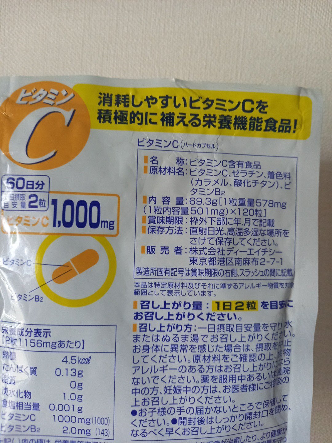- ビタミンCとその働きを助けるビタミンB2をプラスしたサプリメントです。 ビタミンCは、皮膚や粘膜の健康維持を助けるとともに、抗酸化作用をもつ栄養素です。ハードカプセルなので、ビタミンCの酸味が苦手な方にもおすすめです。 栄養機能表示 ●ビタミンCは、皮膚や粘膜の健康維持を助けるとともに、抗酸化作用をもつ栄養素です。 ●ビタミンB2は、皮膚や粘膜の健康維持を助ける栄養素です。 ※本品は、多量摂取により疾病が治癒したり、より健康が増進するものではありません。一日の摂取目安量を守ってください。 ※本品は、特定保健用食品と異なり、消費者庁長官による個別審査を受けたものではありません。 ※水またはぬるま湯でお召し上がりください。 【名称】 ビタミンC含有食品 【原材料名】 ビタミンC、ゼラチン、着色料(カラメル、酸化チタン)、ビタミンB2 【飲み方】 一日の摂取目安量2粒 【栄養成分表示】 [1日あたり:2粒1156mg] 熱量4.5kcal、たんぱく質0.13g、脂質0g、炭水化物1.0g、食塩相当量0.001g、ビタミンC 1000mg(1000)、ビタミンB2 2.0mg(143) 上記( )内の値は、栄養素等表示基準値(18歳以上、基準熱量2200kcal)に占める割合[%]です。 アレルギー物質 ゼラチン ※一日の目安量を守って、お召し上がりください。 ※お身体に異常を感じた場合は、摂取を中止してください。 ※特定原材料及びそれに準ずるアレルギー物質を対象範囲として表示しています。原材料をご確認の上、食物アレルギーのある方はお召し上がりにならないでください。 ※薬を服用中あるいは通院中の方、妊娠中の方は、お医者様にご相談の上お召し上がりください。 ●直射日光、高温多湿な場所をさけて保存してください。 ●お子様の手の届かないところで保管してください。 ●開封後はしっかり開封口を閉め、なるべく早くお召し上がりください。 食生活は、主食、主菜、副菜を基本に、食事のバランスを。