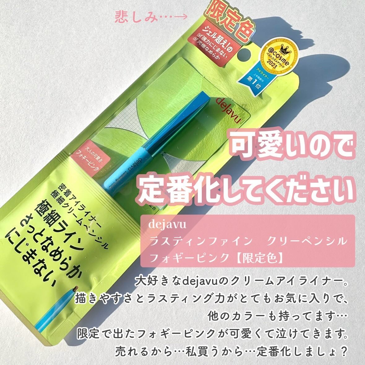 するする描きやすくて、ペンシルアイライナー苦手な私でも折れることなく描ける助かるアイライナー。密着力も高くて、夕方まで汚くならないところも⭕️ いつも限定カラーが可愛いんです🩷 お気に入りはフォギーピンク🌸 パッケージリニューアルしたのね✨ 前までキャップだけ色が違ってたから初め違う製品?って思ってしまった🤣