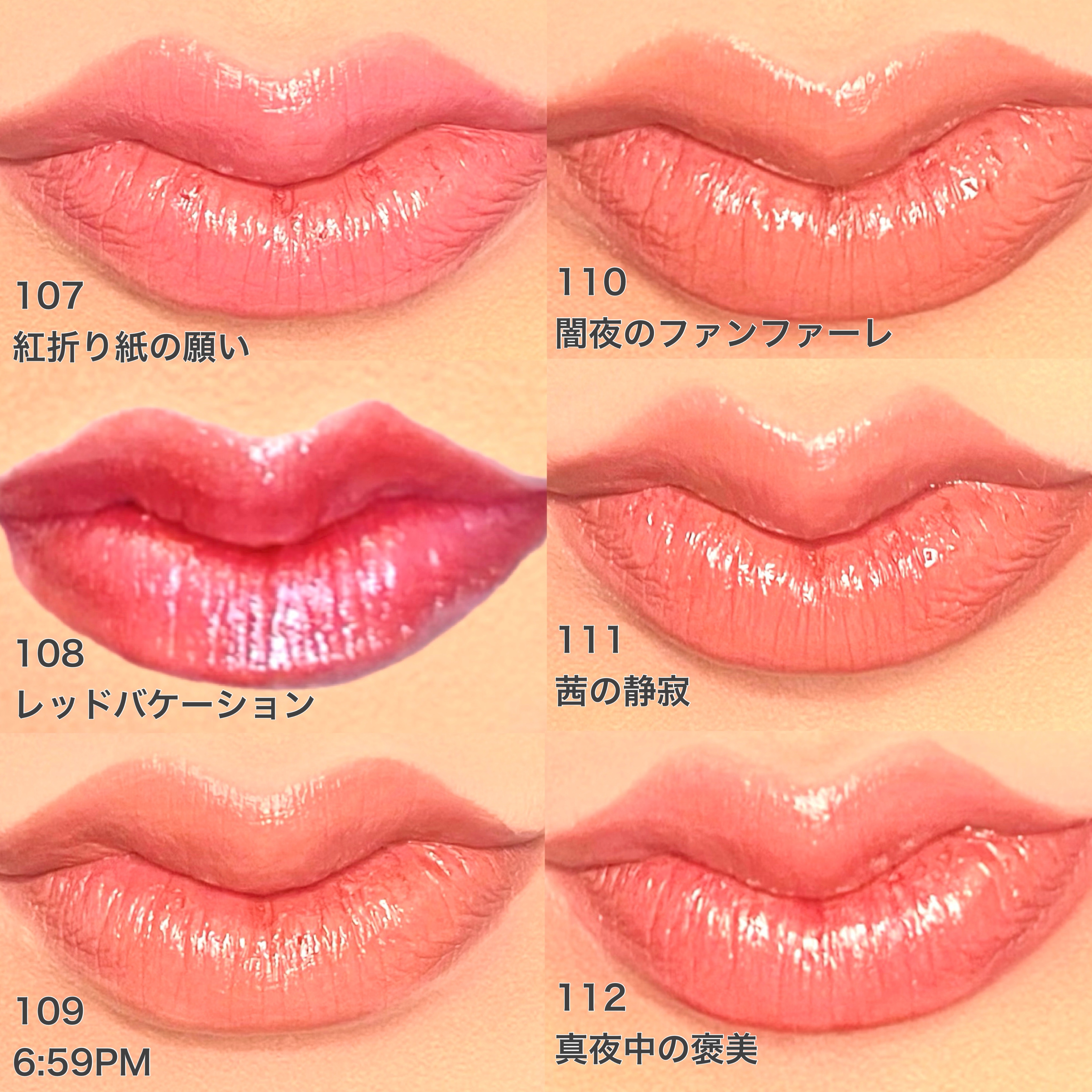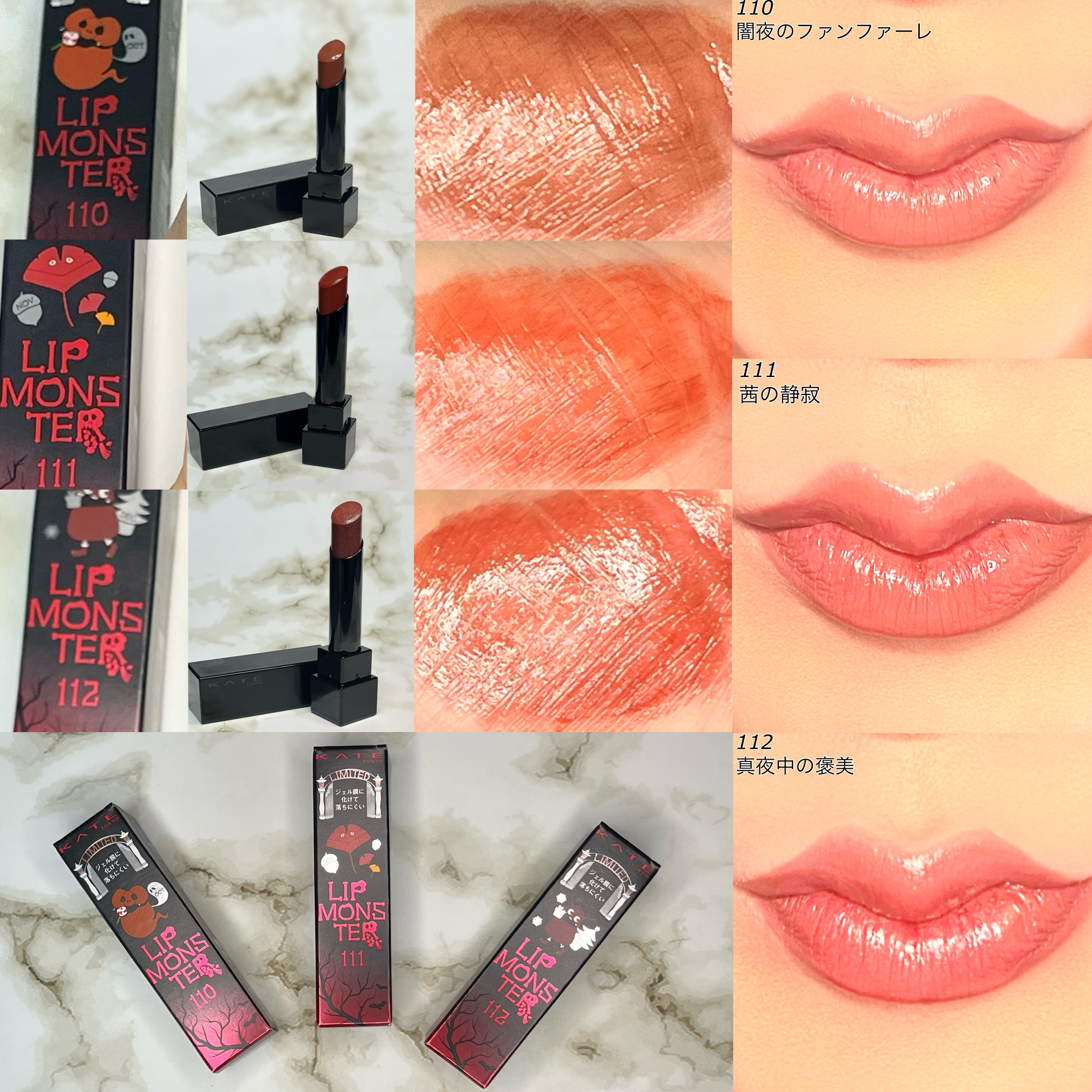 KATE リップモンスター 102 甘い主役 103 秘めた炎 104 桜色のひと時 106 夜雲の涙 107 紅折り紙の願い 110 闇夜のファンファーレ 112 真夜中の褒美 手持ちの7色を並べてみました #KATE #リップモンスター #マイリップモンスター