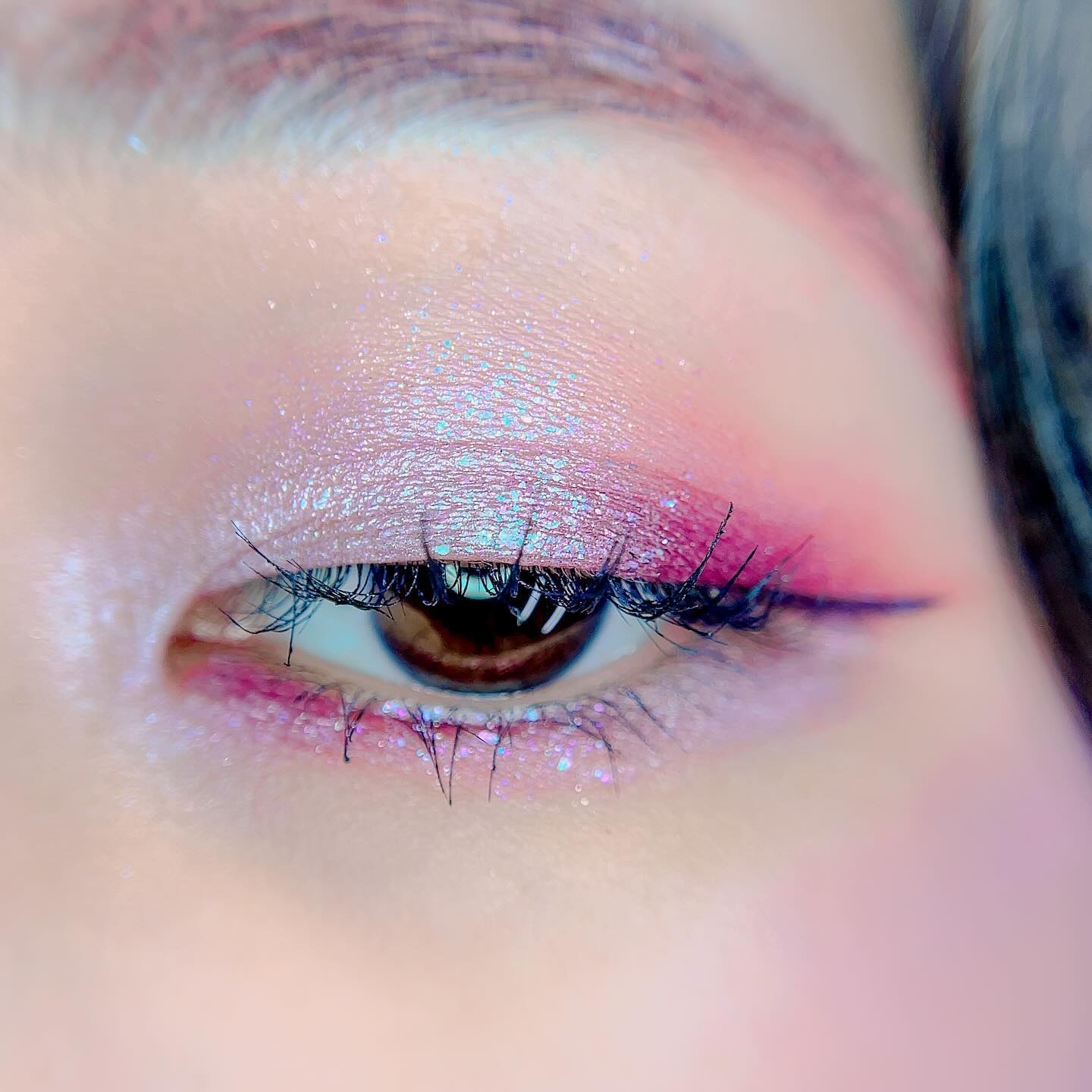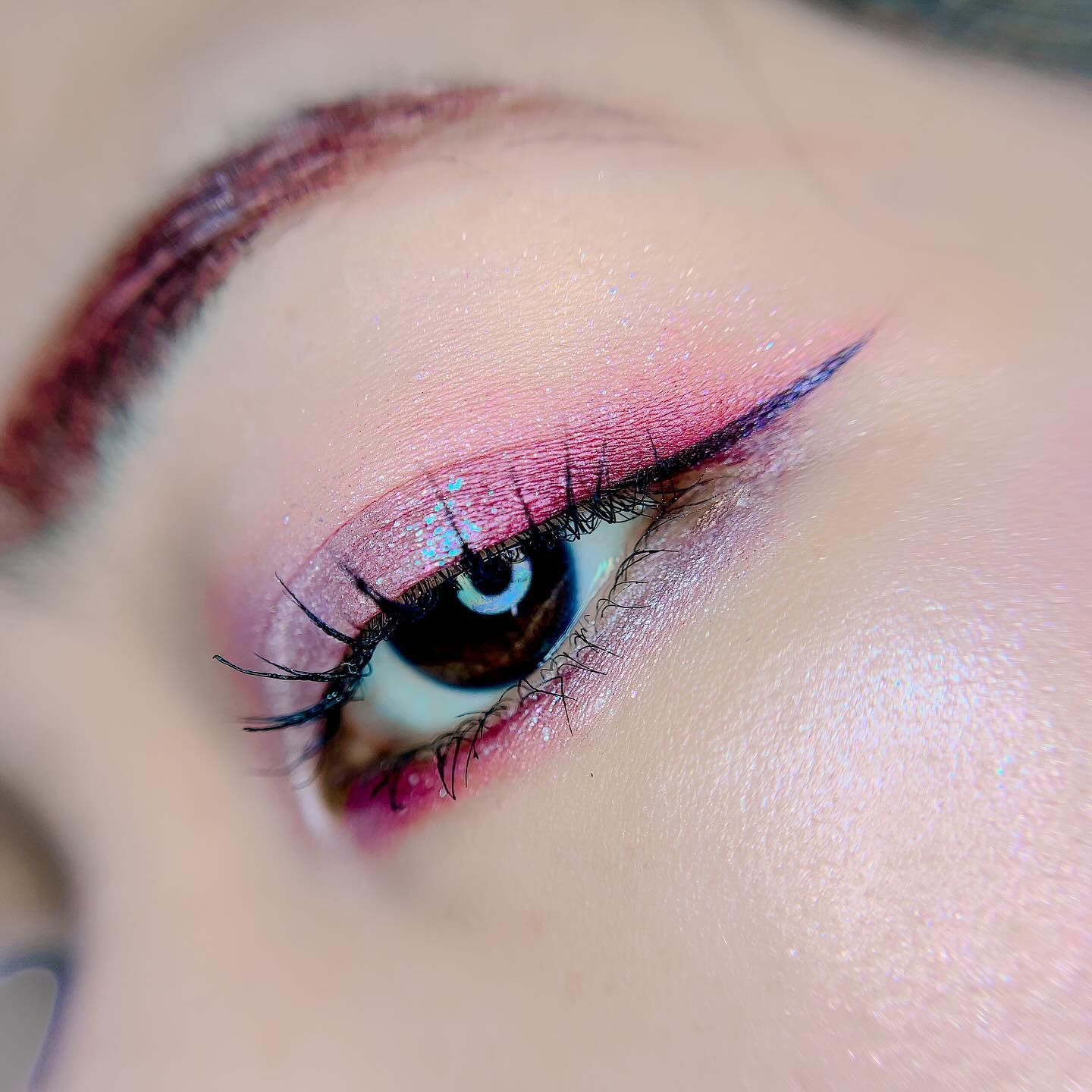 ピンクにグレージュも良いですね👌💗 今日は可愛らしい感じにしてみました💕 上下瞼黒目〜目頭側にラメを塗ってキラキラさせております🤩 目尻はマットのピンクを濃いめに重ねて💗 グレージュのアイライナーと相性◎