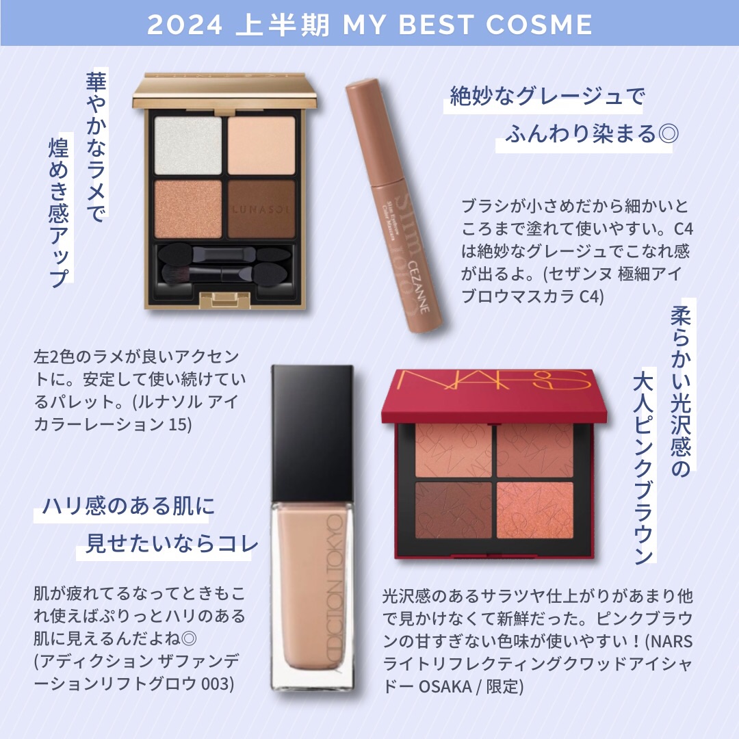 一つでマットやサテン、メタリックなど様々なテクスチャーがある楽しめるパレット。 689ミッツァ 全体的にしっとり質感で高発色です。 ブラウンベースで構成されていますが真ん中のレッドがいいアクセントに。 どんな組み合わせでもぐっと深みの出る目元になりますよ。 429トワルドゥジュイ 薄めに仕上がる発色なので、物足りなさを感じる人がいるかも… とにかくナチュラルが好き!という方にはおすすめです。 真ん中のくすみの入ったベージュはあまり見ないカラーだと思います。 同じシリーズですが全体的なテクスチャーがかなり違いました。特に429はサラサラよりで粉含みはあまり良くないかな…… ただどちらも密着感はあり、時間が経ってもヨレは目立ちませんでした。