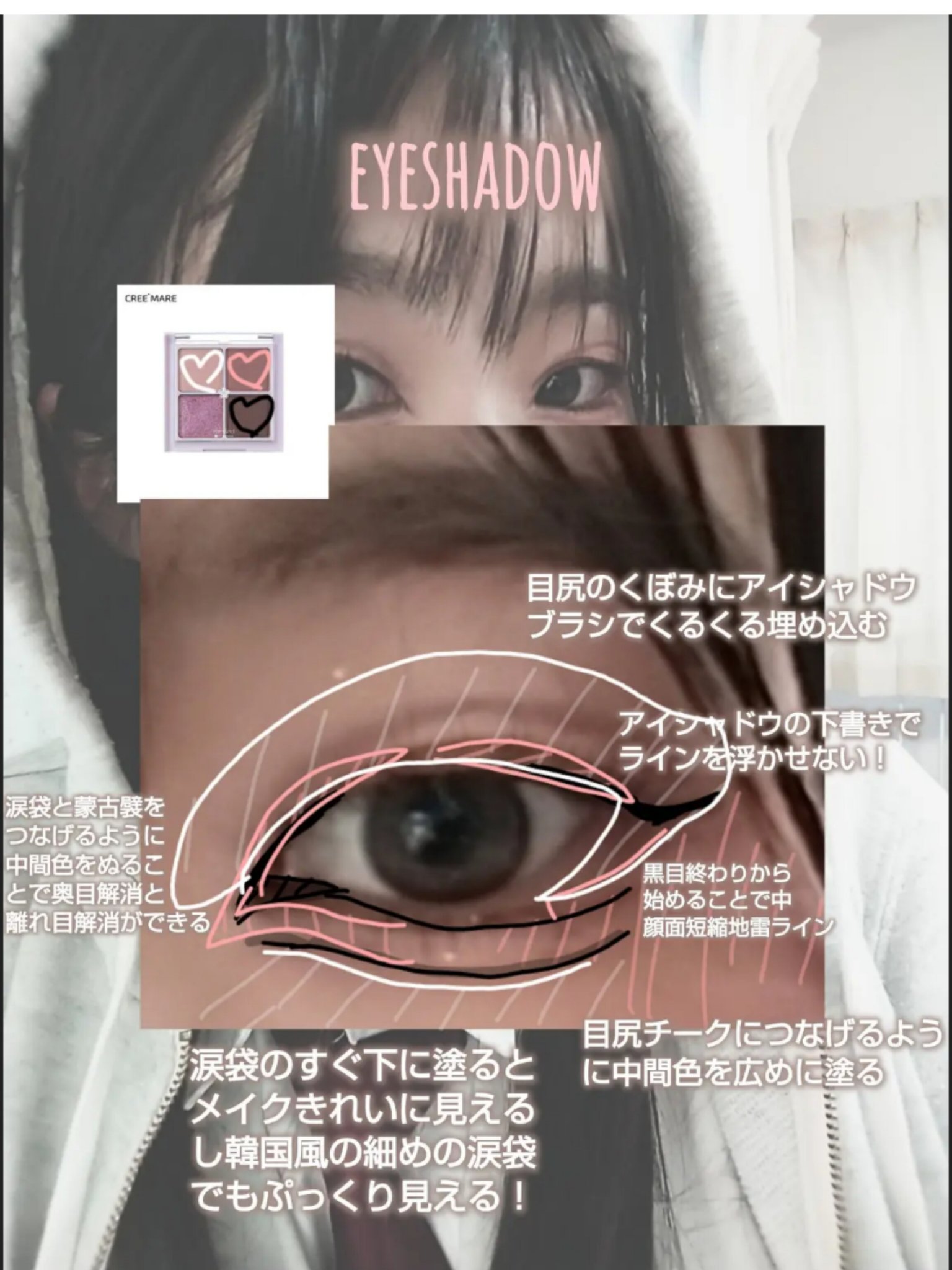 ベージュを使うことで目線が上に行かないので下重心のお顔に見えます! 中顔面短縮◎デカ目◎ アイラインの下書きすることで長く引いても馴染む◎ 目頭に少しはみ出るように丸い線で切開することで劇的に丸目◎離れ目解消◎デカ目◎ 明るめコンシーラーを少し塗る。(ペンシルタイプがオヌヌメ) 涙袋の中央に塗ることでよりぷっくり! 丸目◎中顔面短縮◎デカ目◎ 目元がうるうる! 涙袋にT字なぬることで中顔面短縮◎丸目◎涙袋大きく見える◎うるうるMAX! まつげにスクリューブラシでパウダーをつけてまつげ上げてから黒目上中心にマスカラ下地→マスカラ→ビューラーのカチカチにパウダーつけたパフ挟んであげる→ピンセットを上下するとデカ目◎丸目◎中顔面短縮◎