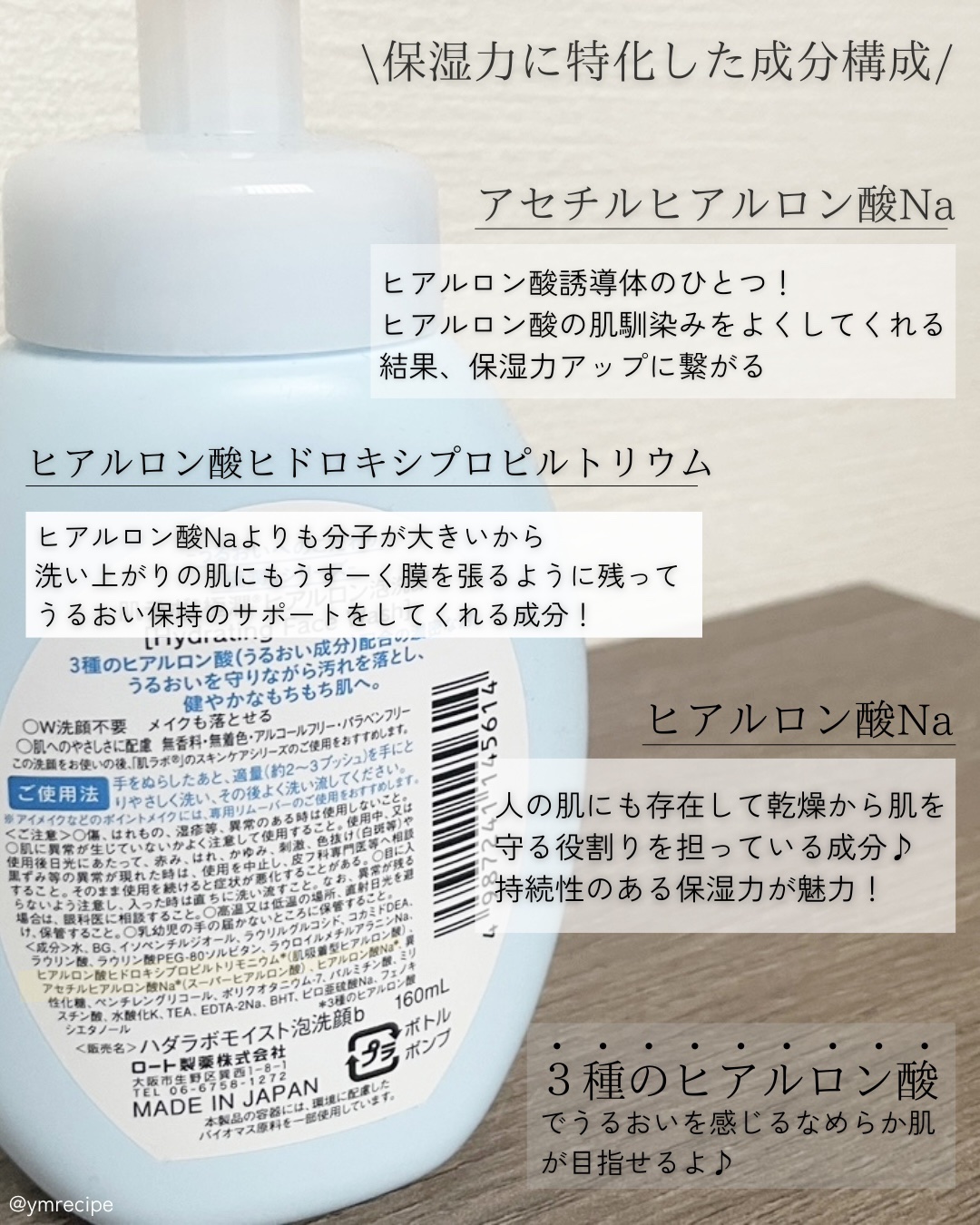 - 「肌ラボ 極潤 ヒアルロン泡洗顔」は、うるおい感と心地よい洗い上がりにこだわった洗顔料です。 3種のヒアルロン酸*1配合の濃密な泡。うるおいを守りながら汚れを落とし、洗うたび健やかなもちもち肌へ導きます。 W洗顔不要でメイクも落とせます*2。 肌へのやさしさに配慮した、無香料・無着色・アルコール(エタノール)フリー・パラベンフリー。 肌ラボは、「肌にいいこと」を突き詰め、健康な素肌を目指す「ヘルススキンケアブランド」です。肌が本当に求めるうるおいを追求すべく、うるおい成分であるヒアルロン酸にこだわり抜き、必要なものはできる限りそぎ落として、デザインも容器もシンプルに。 *1:うるおい成分:ヒアルロン酸ヒドロキシプロピルトリモニウム(肌吸着型ヒアルロン酸) 、アセチルヒアルロン酸Na(スーパーヒアルロン酸)、ヒアルロン酸Na *2:アイメイクなどのポイントメイクには、専用リムーバーのご使用をおすすめします。