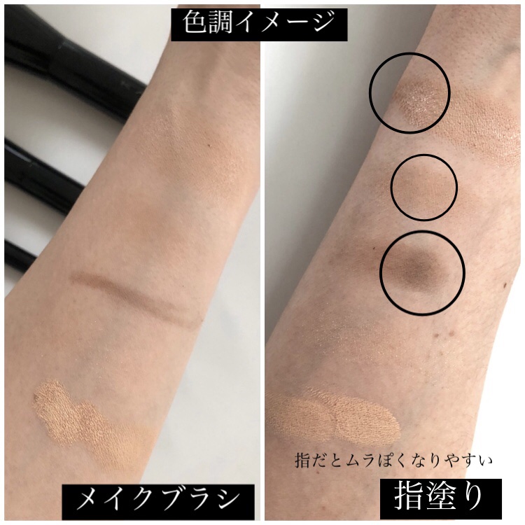 沈み込むタイプのやわらかいスポンジです。チョンととるだけでいいカバー力なので、ふたの裏でつける量を調節。 頬の高い部分から伸ばし、外側へ伸ばしていきます。さらにカバーしたい悩みのあるところに、重ねつけ。 ①オークル やや明るめ〜中間的な明るさ ナチュラルで落ち着いたカラー。暗めの色合いなのでパウダーで調節しています。