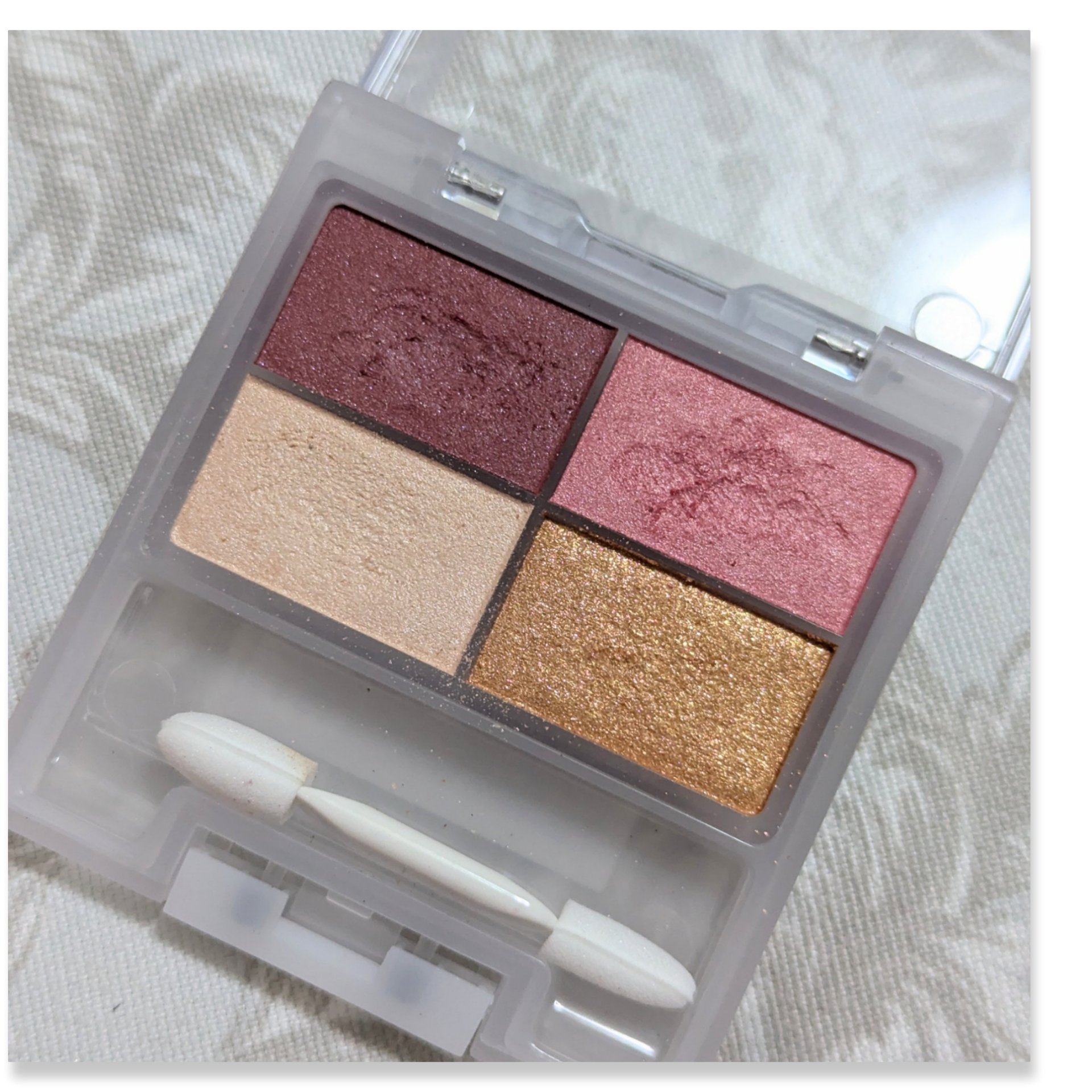 - シェードカラー・ミディアムカラー・ニュアンスカラー・スパークルカラーの4色が1つにまとまったメイクパレットです。 アイシャドウだけでなく、アイブロウやシェーディングとしても使えるカラーが入っているので、眉から目元まで、パレット1つでアイメイクが完成します。 カラーの組み合わせ次第でアレンジが広がり、様々なシーンに合わせたアイメイクを自在に楽しめます。 高密度ウレタン素材のチップ付きです。
