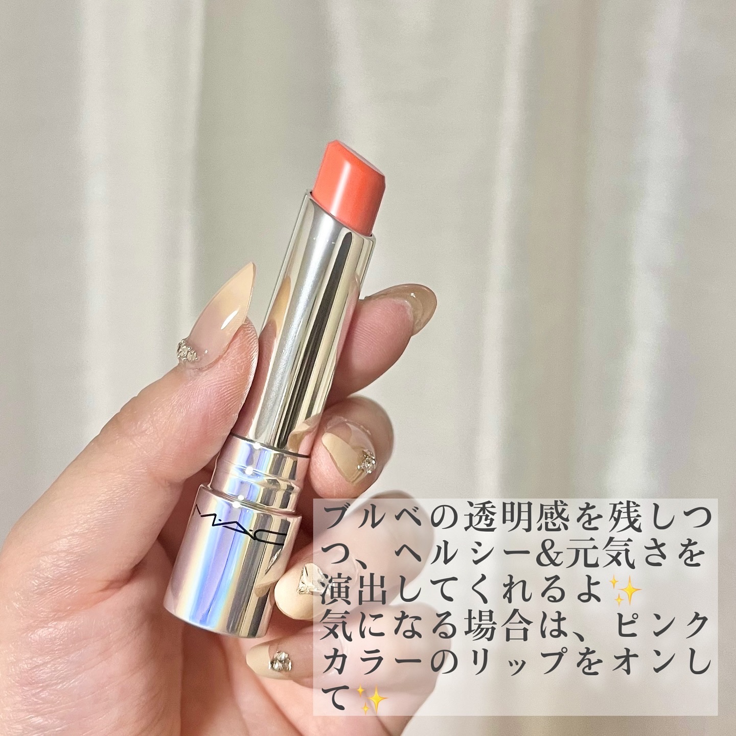 - うそみたい、見た目からは想像つかない。 本来の唇の色よりもヘルシーな血色感でわたしらしさ全開 「こんなにポップな色似合うかな?」そう思った人こそ、今すぐ塗ってみて! リアルな血色を装ってさらりとつけこなせるのに、 色のムードはきちんと残すのがM・A・C流。 ヘルシーなモード感を叶える唯一無二のカラートリック、あなたの唇で体感して。 ①洒落っ気と血色感を両立した、M・A・Cならではのリップバーム アジア人のスキントーンに映える絶妙な血色感を追求しながら、 その色の持つムードを損なわない仕上がりは発色にこだわるM・A・Cならでは。 唇を本来よりもずっとヘルシーに見せて、顔色を明るくモダンに照らし出す。 ②唇の水分量に反応して思いがけない“自分色”に 唇の水分量次第でひとりひとり異なるカラーに変化し、 くすみさえも自分だけの“色”にしてしまうカラートリックは独自のモイストリフレクト処方*1のおかげ。 唇を染めあげるように色づいて、あなたの個性をさりげなくセレブレートする。 ③91%天然由来成分*2。スキンケア級のうるおい感 自然由来のホホバオイルとシアバター*3を贅沢に含むバームは、 とろけるようなテクスチャーとケア効果でしなやかな唇を長時間キープ。 頬に使っても乾きづらく、果実のようなみずみずしさがいつまでも。 ④1本でリップもチークもお直しもできちゃう、頼れるバディ 単色でも他のリップの下地としても、はたまた唇のケアにも大活躍のリップバームは、 頬にささっとスワイプすると湧き上がるツヤめきをもたらすチークに様変わり。 お直しに使えば血色とうるおいをチャージして、厚塗りにならずにフレッシュ感が復活! ⑤唇と環境への優しさ、どちらも大切にしたサステナブル・フォーミュラ ホログラフィックでフォトジェニックなパッケージは、リサイクル可能なアルミ素材を採用。 クリーン・フォーミュラにこだわり、パラベンやパラフィン、鉱物油フリー。 *1人の水分量に反応して自然な血色感を与えるフォーミュラのこと *2 天然由来成分とは、自然由来指数 91%(水を含まない)ISO16128準拠 *3ホホバオイル(ホホバ種子油)、シアバター(シア脂)。共に保湿成分 2024年7月5日 (金) 全国店舗発売 2024年6月11日 (火) 西武渋谷店 先行発売 2024年6月25日 (火) そごう千葉店 先行発売