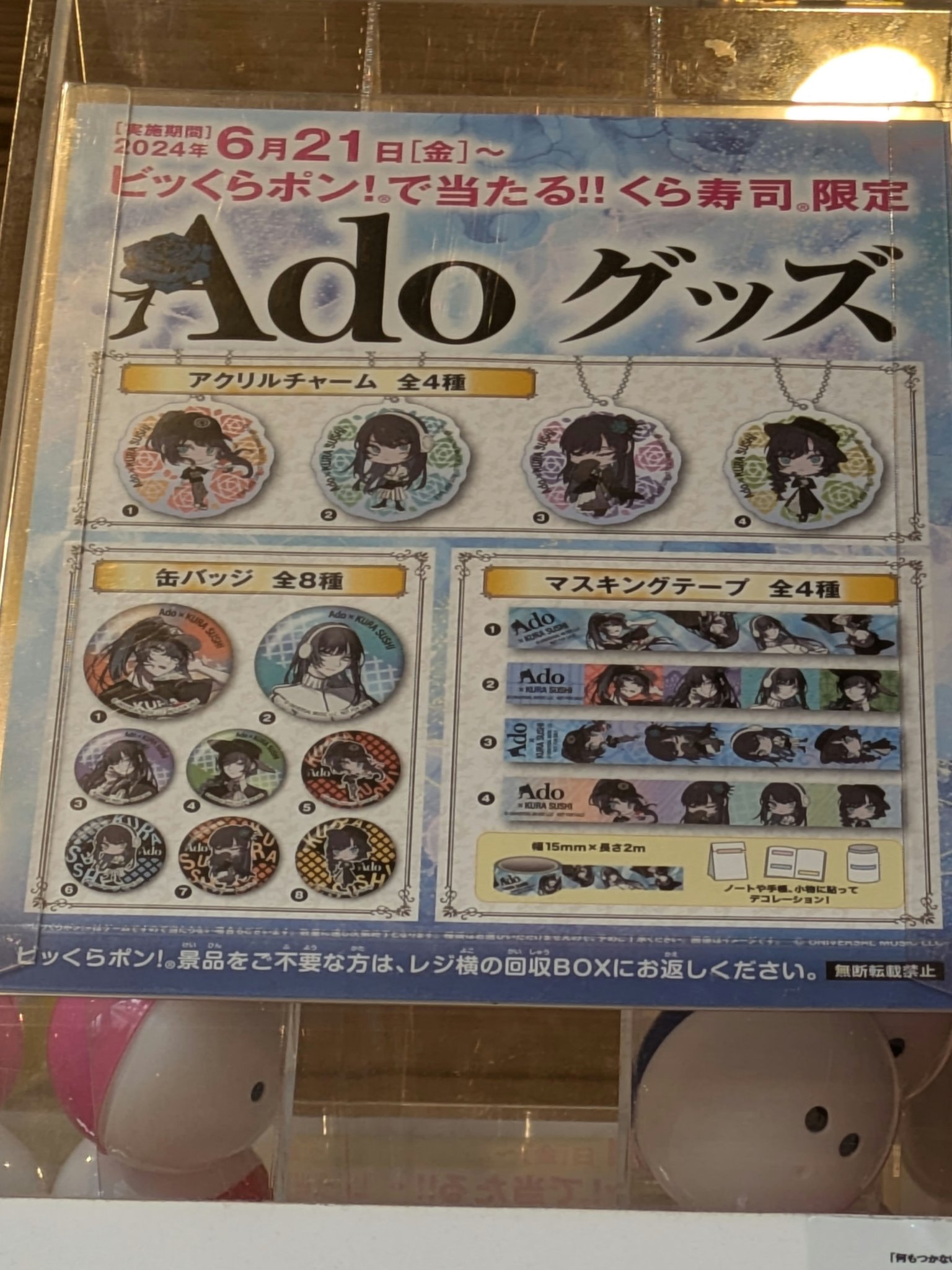 Adoちゃんコラボ目当てです♥ くら寿司はたぶん人生で2度目くらい…? かなーり前に行ったことがある気がするけど 久しぶり過ぎて初めて行ったくらいな気分 今どきはもうほぼ店員さんを介さず 入店&お会計ができる仕組みなのですね… カウンター席も出入り口の側とかではなかったので 食事がしやすかったです ビッくらポン1回分とコラボのロールケーキを 食べてきました🙏 アクリルチャームほしかったけど 缶バッチ当たったのでとても嬉しい(確率で当たらない事もあるんだよね? 絶対当たってほしくて確率アップさせた) ロールケーキはステッカーつき(絵柄はランダムっぽい) 2,500円以上食べるとクリアファイルが 先着でもらえるのを見逃していました…🤣 でもそんなに食べられる気もしなかった笑