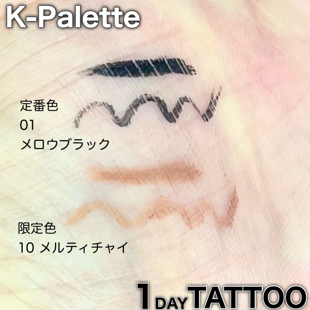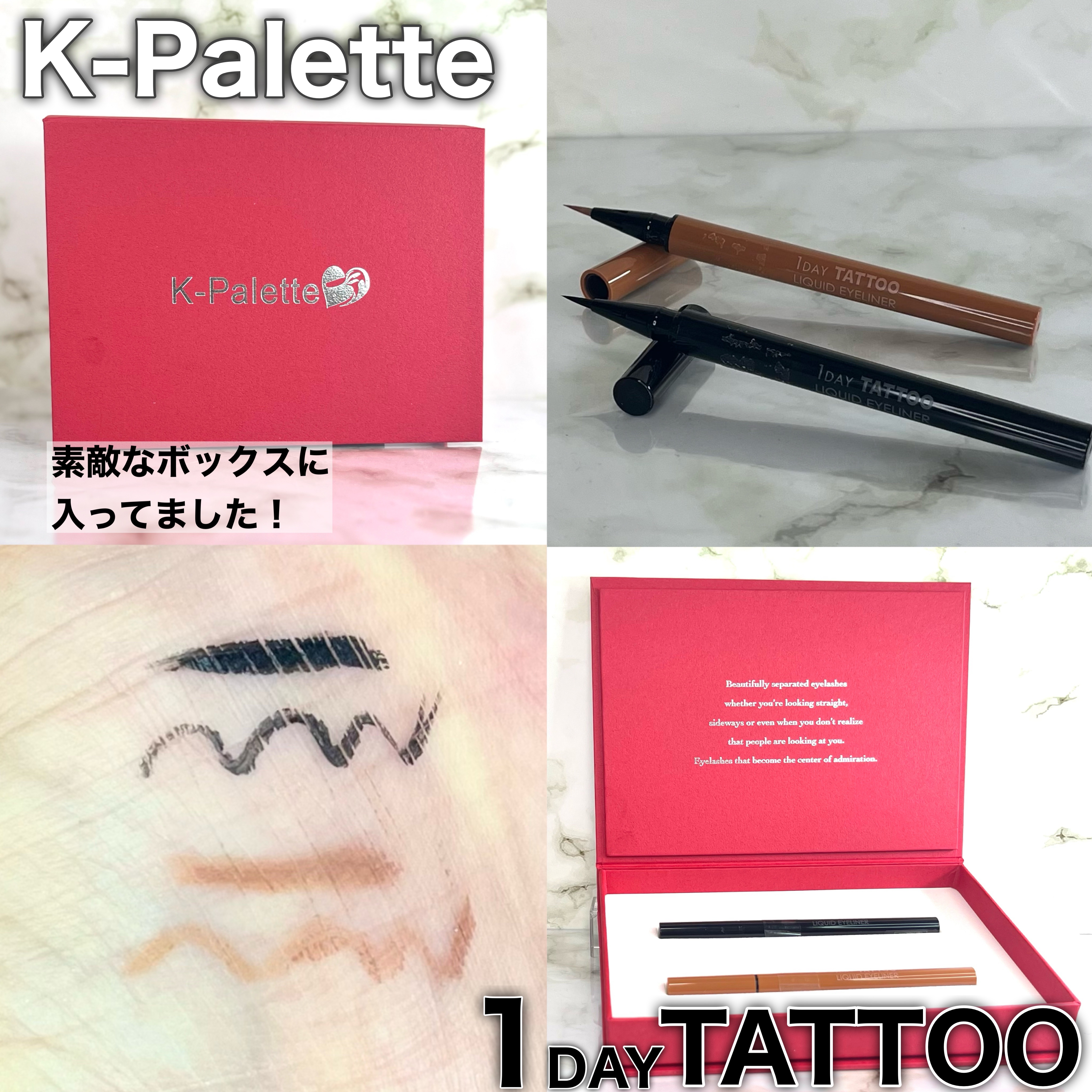 - 『色味』『洒落感』にこだわった新生!『K-パレット 1DAY TATTOO リキッドアイライナー』が登場! 【商品特徴】 1色味の「使いやすさ」と「洒落感」を両立したオリジナルの「スキントーン・カラー」 2メイクや肌トーンに馴染みやすいカラーだから抜け感が生まれ、垢抜け顔に♫ 3「ハイブリッドTATTOO FILM」で朝のキレイを崩さない 4オリジナル「ブレンド筆」で感動の描き心地 5 7種の美容保湿成分配合 6ぬるま湯で簡単オフ! 7色素沈着しにくい! 8速乾・にじみにくい