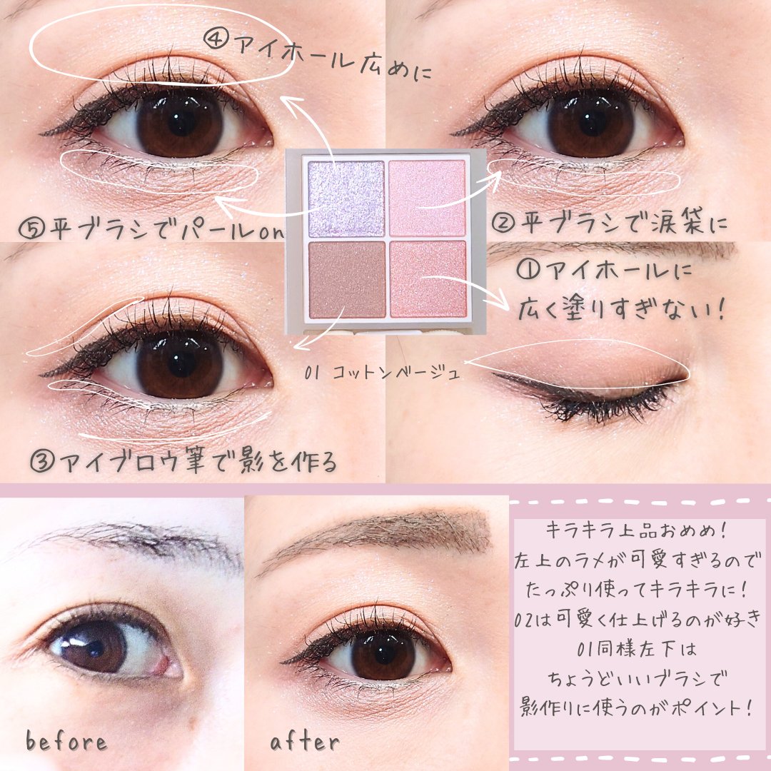 アイシャドウはしっかり色を載せたい平成ガールなので、ペールトーンで目元印象づけれるのか?? と思ってましたが、正解にたどり着いた! 左下のカラーを影作りに使うのが目元をペールトーンに仕上げるポイント!! お気に入りの右下のピンクベージュはアイホールにメインに使ってラメをちょい足し!
