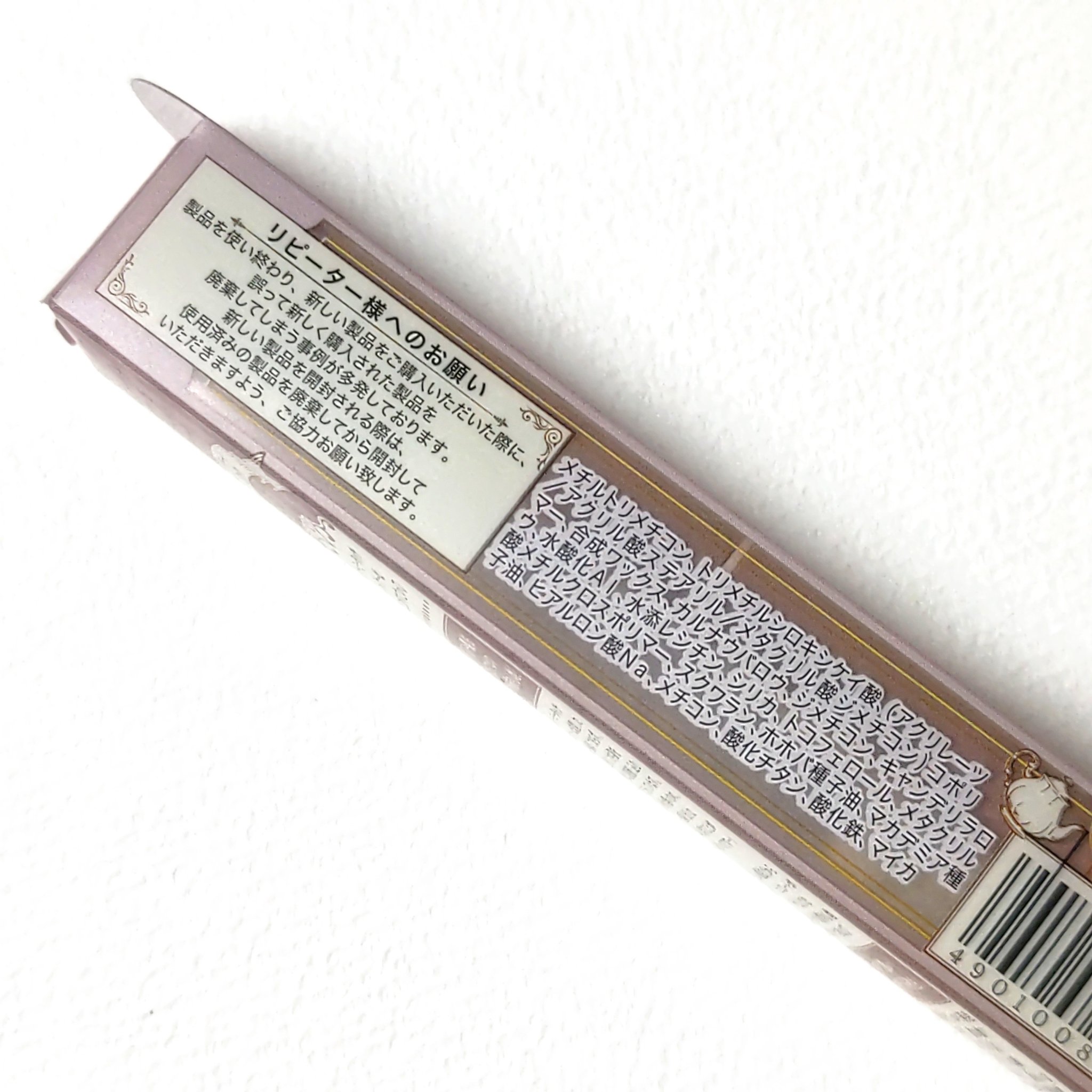 - <01 ディープブラック> メチルトリメチコン、トリメチルシロキシケイ酸、(アクリレーツ/アクリル酸ステアリル/メタクリル酸ジメチコン)コポリマー、ポリエチレン、カルナウバロウ、キャンデリラロウ、ジメチコン、水添レシチン、シリカ、メタクリル酸メチルクロスポリマー、トコフェロール、スクワラン、ホホバ種子油、マカデミア種子油、ヒアルロン酸Na、メチコン、(+/-)水酸化Al、酸化鉄、マイカ、酸化チタン <02 ミディアムブラウン> メチルトリメチコン、トリメチルシロキシケイ酸、(アクリレーツ/アクリル酸ステアリル/メタクリル酸ジメチコン)コポリマー、ポリエチレン、カルナウバロウ、キャンデリラロウ、ジメチコン、水添レシチン、シリカ、メタクリル酸メチルクロスポリマー、トコフェロール、スクワラン、ホホバ種子油、マカデミア種子油、ヒアルロン酸Na、メチコン、(+/-)水酸化Al、酸化鉄、マイカ、酸化チタン <03 ダークブラウン> メチルトリメチコン、トリメチルシロキシケイ酸、(アクリレーツ/アクリル酸ステアリル/メタクリル酸ジメチコン)コポリマー、ポリエチレン、カルナウバロウ、スクワラン、ジメチコン、水添レシチン、シリカ、トコフェロール、メタクリル酸メチルクロスポリマー、キャンデリラロウ、ホホバ種子油、マカデミア種子油、ヒアルロン酸Na、メチコン、水酸化Al、酸化鉄、酸化チタン、マイカ <04 ガーネットバーガンディ> メチルトリメチコン、トリメチルシロキシケイ酸、(アクリレーツ/アクリル酸ステアリル/メタクリル酸ジメチコン)コポリマー、ポリエチレン、カルナウバロウ、ジメチコン、キャンデリラロウ、水添レシチン、シリカ、トコフェロール、メタクリル酸メチルクロスポリマー、スクワラン、ホホバ種子油、マカデミア種子油、ヒアルロン酸Na、メチコン、水酸化Al、酸化鉄、グンジョウ、酸化チタン、マイカ <06 フォギープラム> メチルトリメチコン、トリメチルシロキシケイ酸、(アクリレーツ/アクリル酸ステアリル/メタクリル酸ジメチコン)コポリマー、ポリエチレン、カルナウバロウ、ジメチコン、キャンデリラロウ、水酸化Al、水添レシチン、シリカ、トコフェロール、メタクリル酸メチルクロスポリマー、スクワラン、ホホバ種子油、マカデミア種子油、ヒアルロン酸Na、メチコン、酸化鉄、グンジョウ、酸化チタン、マイカ <07 アズキブラウン> メチルトリメチコン、トリメチルシロキシケイ酸、(アクリレーツ/アクリル酸ステアリル/メタクリル酸ジメチコン)コポリマー、ポリエチレン、カルナウバロウ、キャンデリラロウ、ジメチコン、水添レシチン、シリカ、トコフェロール、メタクリル酸メチルクロスポリマー、スクワラン、ホホバ種子油、マカデミア種子油、水酸化Al、ハイドロゲンジメチコン、ヒアルロン酸Na、メチコン、酸化鉄、グンジョウ、マイカ、酸化チタン <09 ダージリンピンク> メチルトリメチコン、トリメチルシロキシケイ酸、(アクリレーツ/アクリル酸ステアリル/メタクリル酸ジメチコン)コポリマー、合成ワックス、カルナウバロウ、キャンデリラロウ、ジメチコン、水酸化Al、ハイドロゲンジメチコン、水添レシチン、シリカ、トコフェロール、メタクリル酸メチルクロスポリマー、スクワラン、ホホバ種子油、マカデミア種子油、ヒアルロン酸Na、メチコン、酸化鉄、酸化チタン、マイカ、グンジョウ <11 クラウディーグレー> メチルトリメチコン、トリメチルシロキシケイ酸、(アクリレーツ/アクリル酸ステアリル/メタクリル酸ジメチコン)コポリマー、合成ワックス、カルナウバロウ、ジメチコン、キャンデリラロウ、水酸化Al、水添レシチン、シリカ、トコフェロール、メタクリル酸メチルクロスポリマー、ハイドロゲンジメチコン、スクワラン、ホホバ種子油、マカデミア種子油、ヒアルロン酸Na、メチコン、酸化鉄、酸化チタン、マイカ <15 カプチーノピンク> メチルトリメチコン、トリメチルシロキシケイ酸、(アクリレーツ/アクリル酸ステアリル/メタクリル酸ジメチコン)コポリマー、合成ワックス、カルナウバロウ、ジメチコン、キャンデリラロウ、水酸化Al、水添レシチン、シリカ、トコフェロール、メタクリル酸メチルクロスポリマー、スクワラン、ホホバ種子油、マカデミア種子油、ヒアルロン酸Na、メチコン、酸化チタン、酸化鉄、マイカ <05 ビターキャラメル> メチルトリメチコン、トリメチルシロキシケイ酸、(アクリレーツ/アクリル酸ステアリル/メタクリル酸ジメチコン)コポリマー、ポリエチレン、カルナウバロウ、ジメチコン、キャンデリラロウ、水添レシチン、シリカ、トコフェロール、メタクリル酸メチルクロスポリマー、スクワラン、ホホバ種子油、マカデミア種子油、ヒアルロン酸Na、メチコン、水酸化Al、酸化鉄、マイカ、酸化チタン <08 マッチャカーキ> メチルトリメチコン、トリメチルシロキシケイ酸、(アクリレーツ/アクリル酸ステアリル/メタクリル酸ジメチコン)コポリマー、合成ワックス、