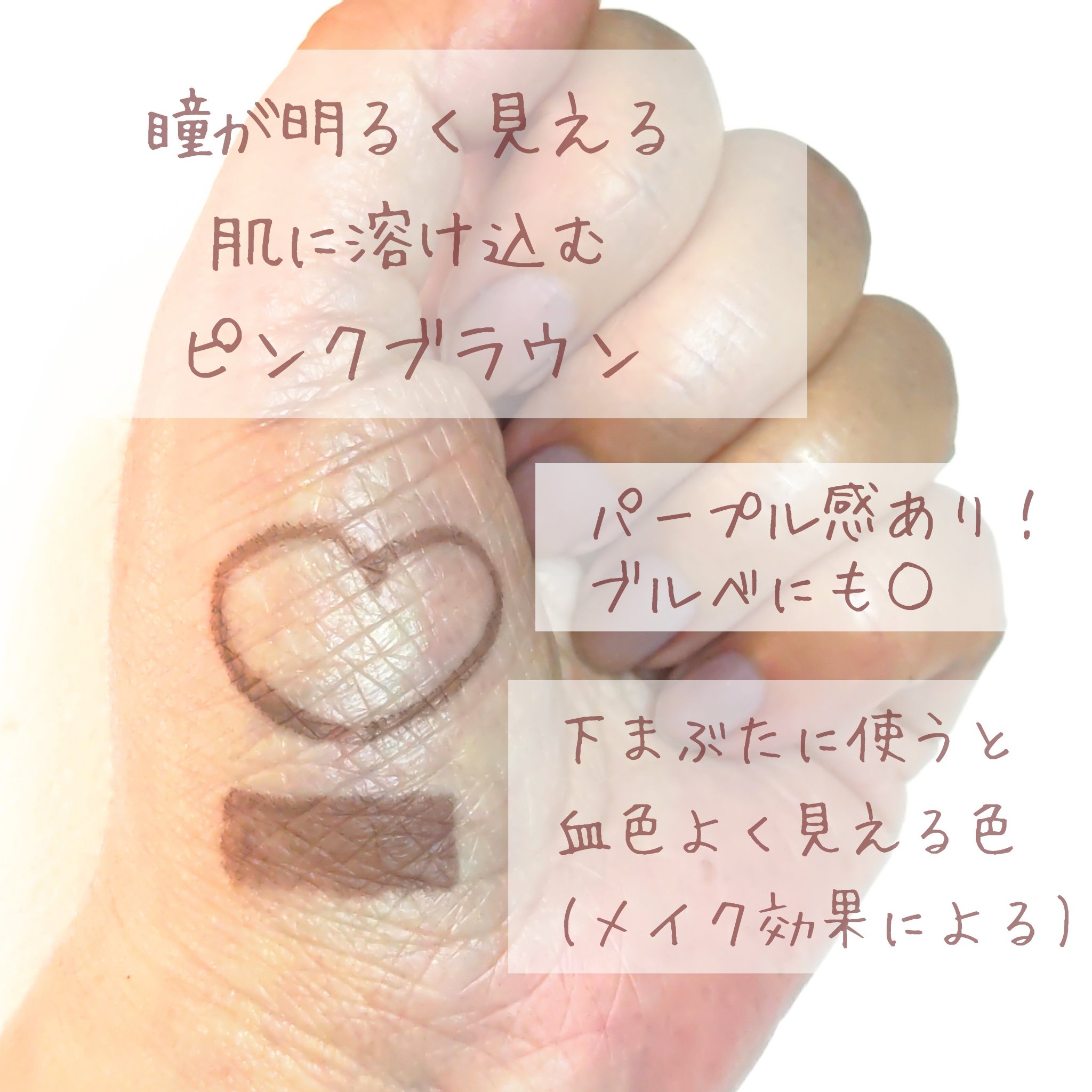 全体をパッと見るとグレージュ系のパレット よくよく見ると肌になじむピンクやモーヴもほんのり感じられる 右2色のラメは淡く儚げな輝き 上段は淡く、柔らかな色出し 右上のピンクラメでさりげない濡れツヤ感が出せる 左上はパール感あり 下段はココア系 ツールで発色をコントロールできるので ナチュラル仕上げにも、しっかりメイクしたい時にも使える ブラシでさらさら塗る➡️肌の自然な影のようになじむ アイシャドウベース+指塗り➡️強く発色する