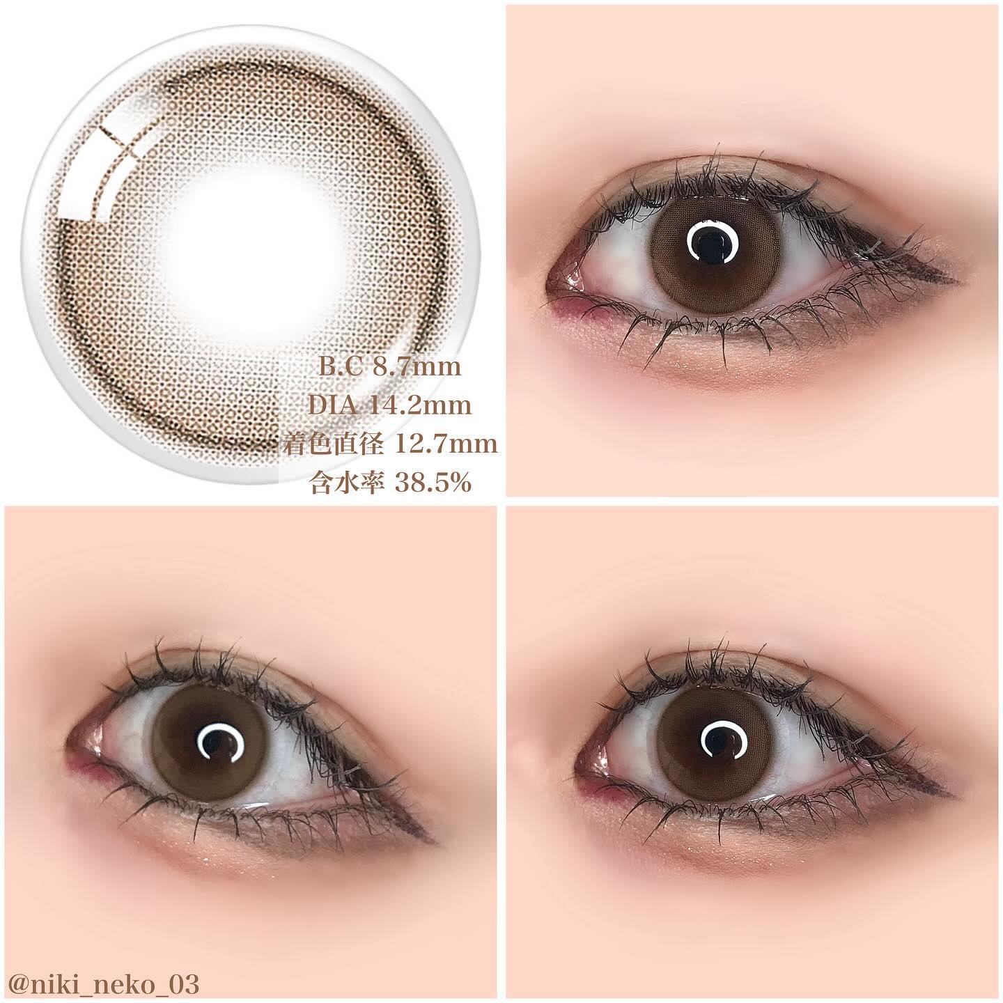 ふんわりやさしいミルキーカラー🤎 淡い色合いだけど瞳に馴染みやすくて、まるで色素薄い系な瞳に♪ フチはくっきりとした濃いめのブラウンで、瞳をくりっと見せてくれるよ! 着色直径も12.7mmと小さめサイズだから、デイリー使いにおすすめだよ😍