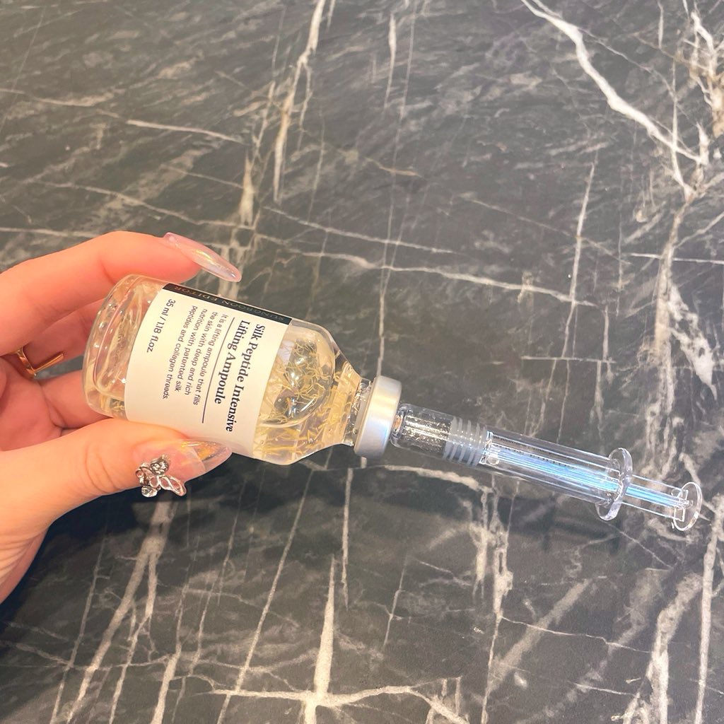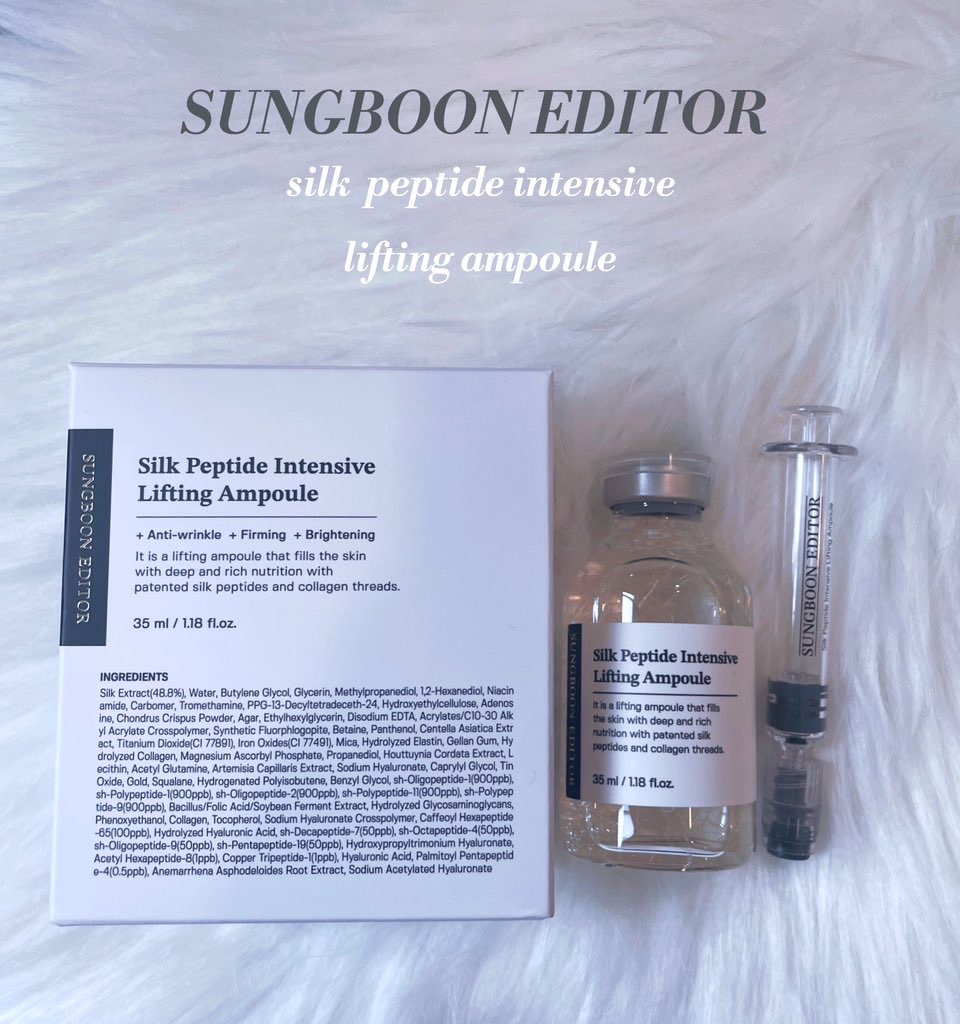 金色の糸が入った美容液なんて初めて見たSUNGBOONEDITOR成分エディターシルクペプチドインテンシブリフティングアンプル35ml注射器で吸い上げて使う珍しい形の美容液です。金色のコラーゲン糸が入っていて、潤いとハリが供給されるんだとか。...