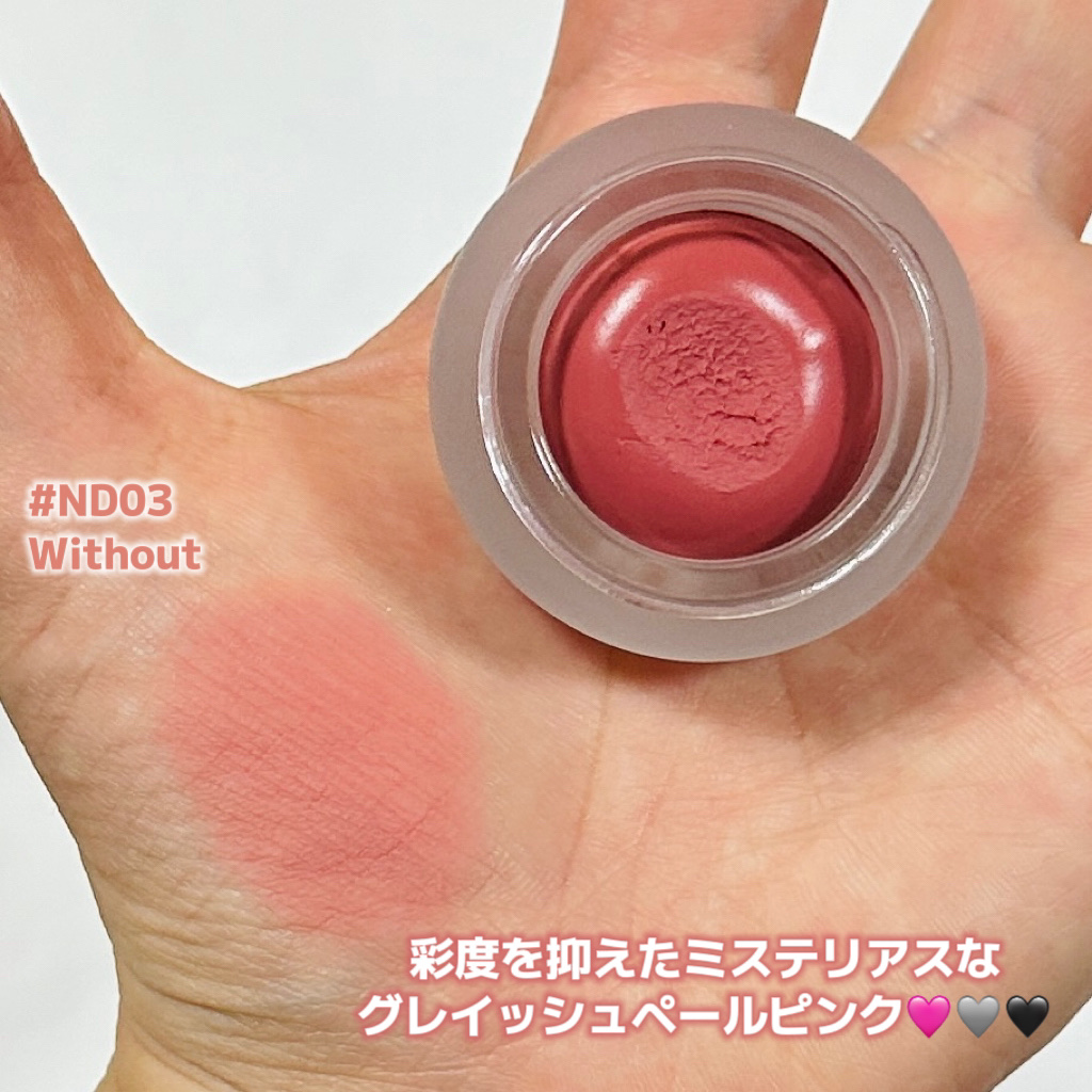 ブルベ夏、ブルベ冬におすすめのカラー♡ without:彩度を抑えたミステリアスなグレイッシュペイルピンク 触り心地はふわっふわ! 唇に塗り広げるとサラッと触感に変わります。🌬️ 色味はとても可愛いのでおすすめです💭