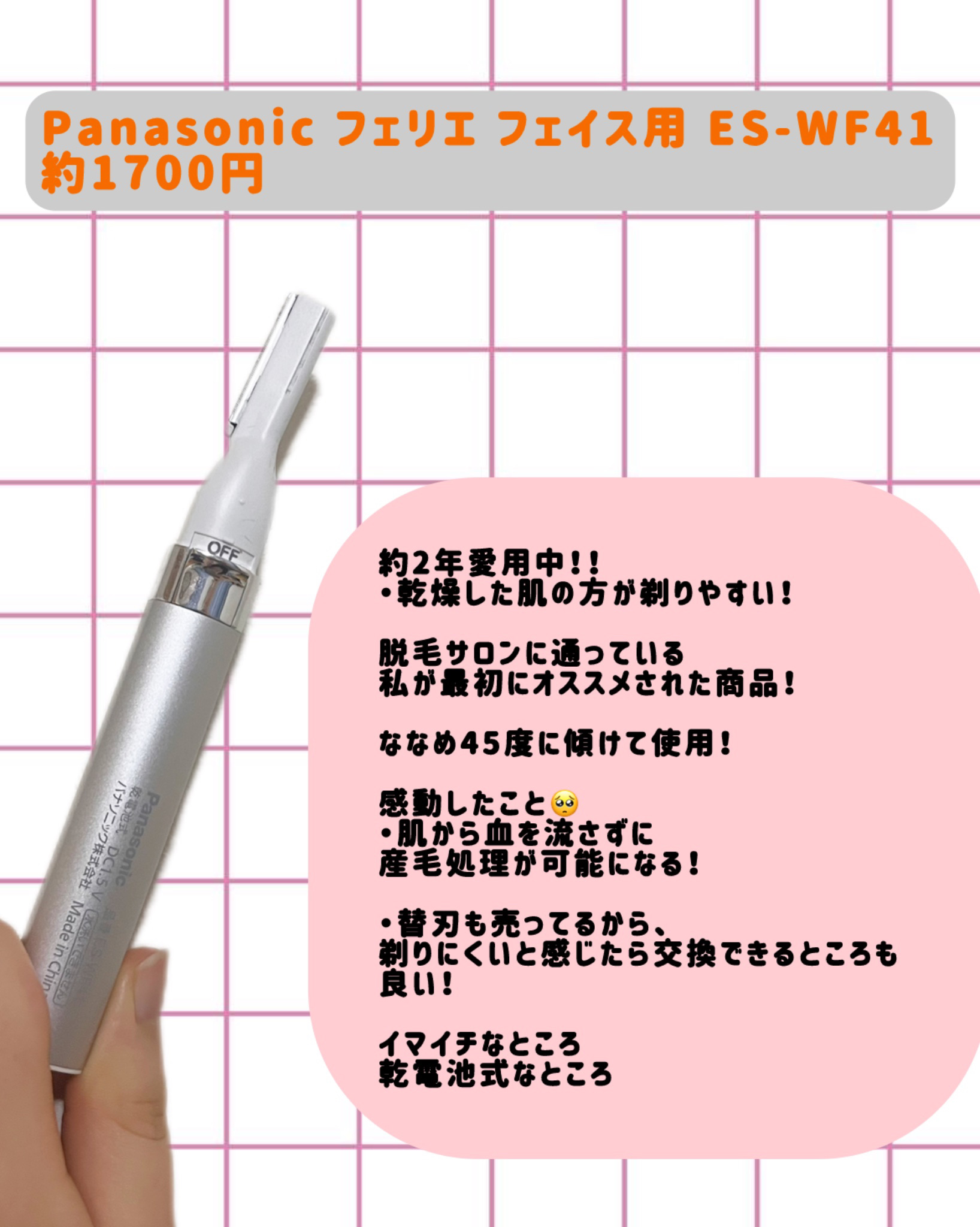 Panasonicフェリエフェイス用ES-WF41ルージュピンク【ファンデノリが悪いのは顔のうぶ毛?】買った理由はまつ毛美容液で目頭や目尻に毛が生えてきちゃって処理したいなーの気持ちで購入眉毛なんかの太い毛は根元からスッキリ剃れないけどうぶ毛...