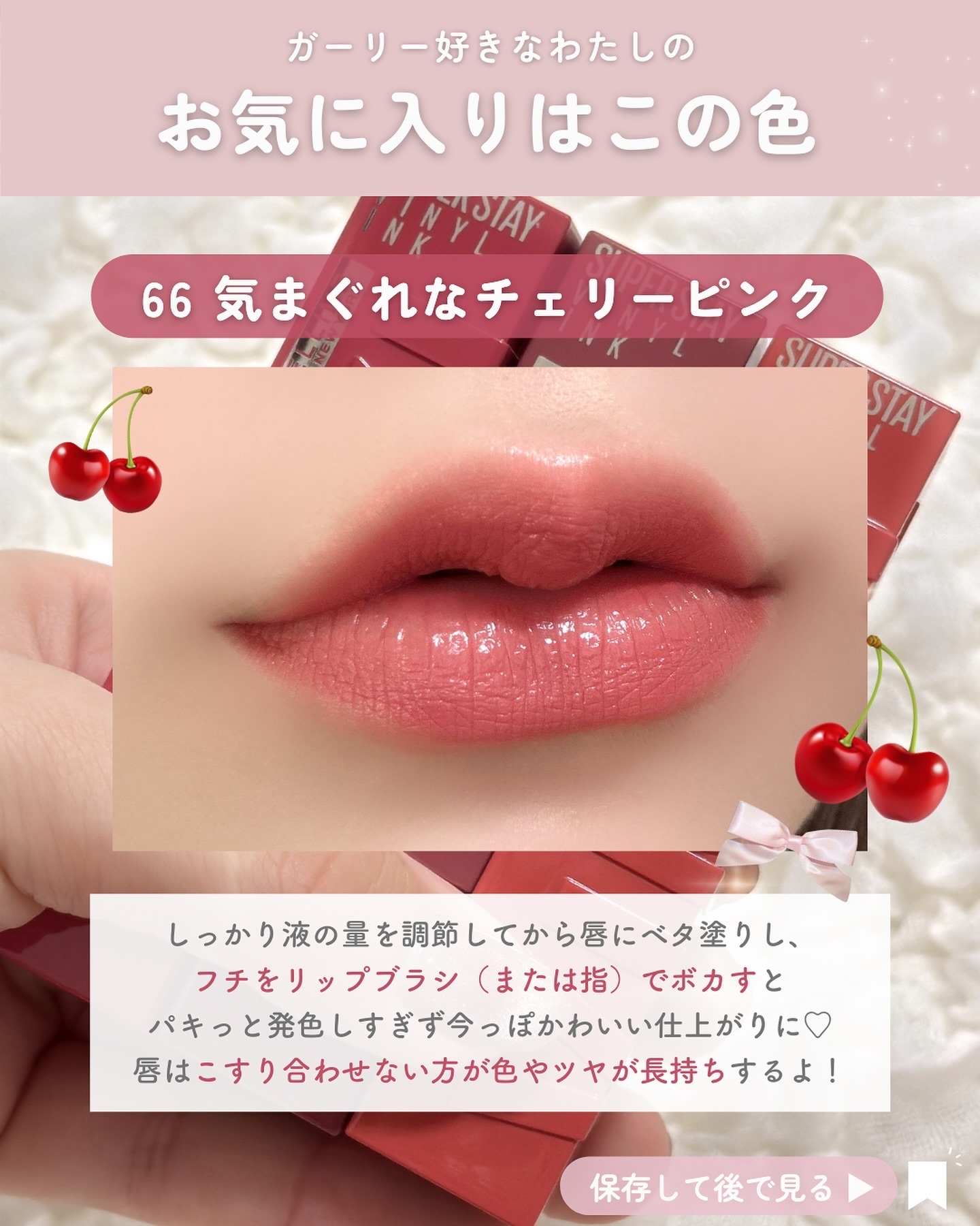 - メイベリン人気No.1リップ からツヤタイプついに誕生!*1 シャカシャカ振って!#落ちないリップ*2 色・ツヤ・仕上がり、全てロック。 〈製品特徴〉 ①シャカシャカ振って、長持ち効果! 膜形成成分*3と高濃度ピグメント*4の2層構造。 シャカシャカ振ると膜形成成分*3と高濃度ピグメント*4が混ざり、 色、ツヤ、仕上がりの長持ち効果! ②色もツヤも落ちない! 最長16時間続く、#落ちないリップ*2 メイベリン独自のトリプルロックフォーミュラ。色・ツヤ・仕上がり、全てロック。 食べても、飲んでも、塗りたての仕上がりが落とすまで続く。*2 ③濃密な発色とツヤをひと塗りで。 塗った瞬間、ムラなく発色。 顔色まで明るくトーンアップするような仕上がりに。*5 ④唇を包み込み、うるおい感ある仕上がりに。 乾燥しにくく、一日中*6心地良い仕上がりに。 塗った瞬間、唇をふっくらとみせ、縦じわが目立ちにくい。 *1:インテージSRI+調べ。2018年9月~2022年7月までのスーパー、ドラッグストア等におけるメイベリン ニューヨーク リップカテゴリーでの売上金額に基づく。 *2:着用16時間を想定した最長の場合において。メイクアップリムーバーで落とすことが可能です。メイベリン ニューヨーク調べ。個人差があります。 *3:トリメチルシロキシケイ酸、ポリプロピルシルセスキオキサン、アルキル(C30-45)ジメチルシリルポリプロピルシルセスキオキサン、ポリメチルシルセスキオキサン/トリメチルシロキシケイ酸。 *4:メイベリン従来品(ウォーター シャイニー ボリューミー パール)と比較において、3倍のピグメントを配合 *5:メイクアップ効果 *6:メイベリン ニューヨーク調べ。個人差があります。