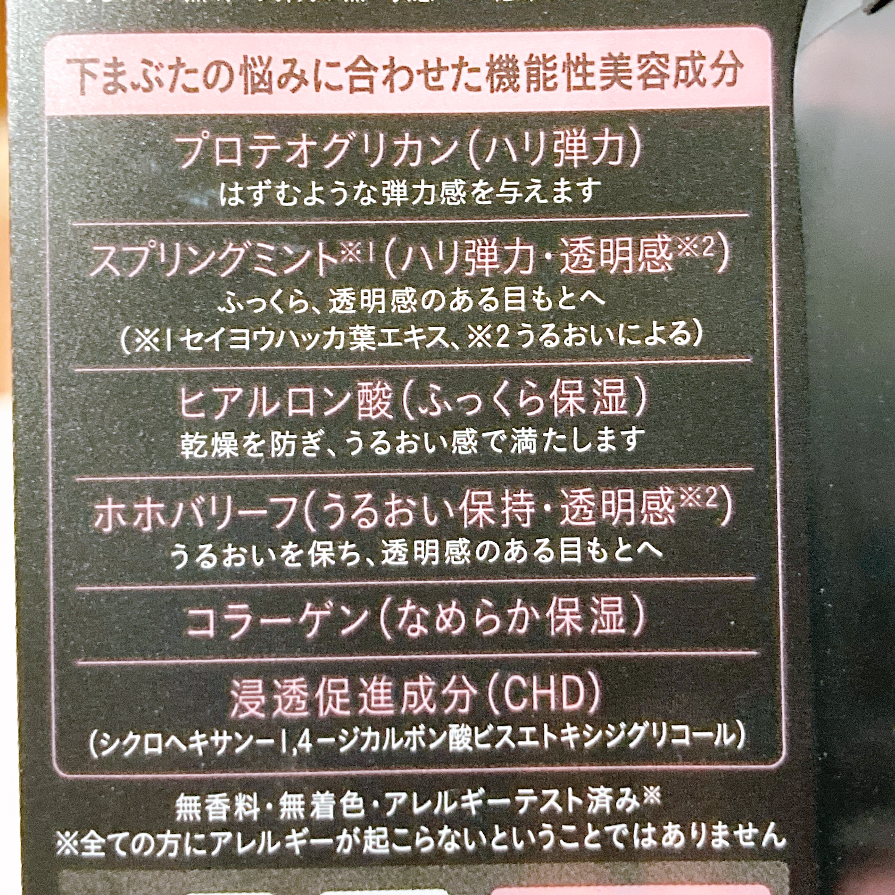 - 下まぶたの「ゆるみ」ケアができる下まぶた用美容液 ●下まぶたの悩みに合わせた機能性美容成分配合 〇「プロテオグリカン」(ハリ弾力) はずむような弾力感を与えます。 〇「スプリングミント」(※1)(ハリ弾力・透明感) ふっくら、透明感のある目もとへ導きます。 〇「ヒアルロン酸」(ふっくら保湿) 乾燥を防ぎ、うるおい感で満たします。 〇「ホホバリーフ」(うるおい保持・透明感) うるおいを保ち、透明感のある目もとへ導きます。 〇「コラーゲン」(なめらか保湿) 〇浸透促進成分「CHD」(※2) ※1 セイヨウハッカ葉エキス ※2 シクロヘキサン-1.4-ジカルボン酸ビスエトキシジグリコール ●無香料、無着色 ●アレルギーテスト済み(全ての方にアレルギーが起こらないということではありません)