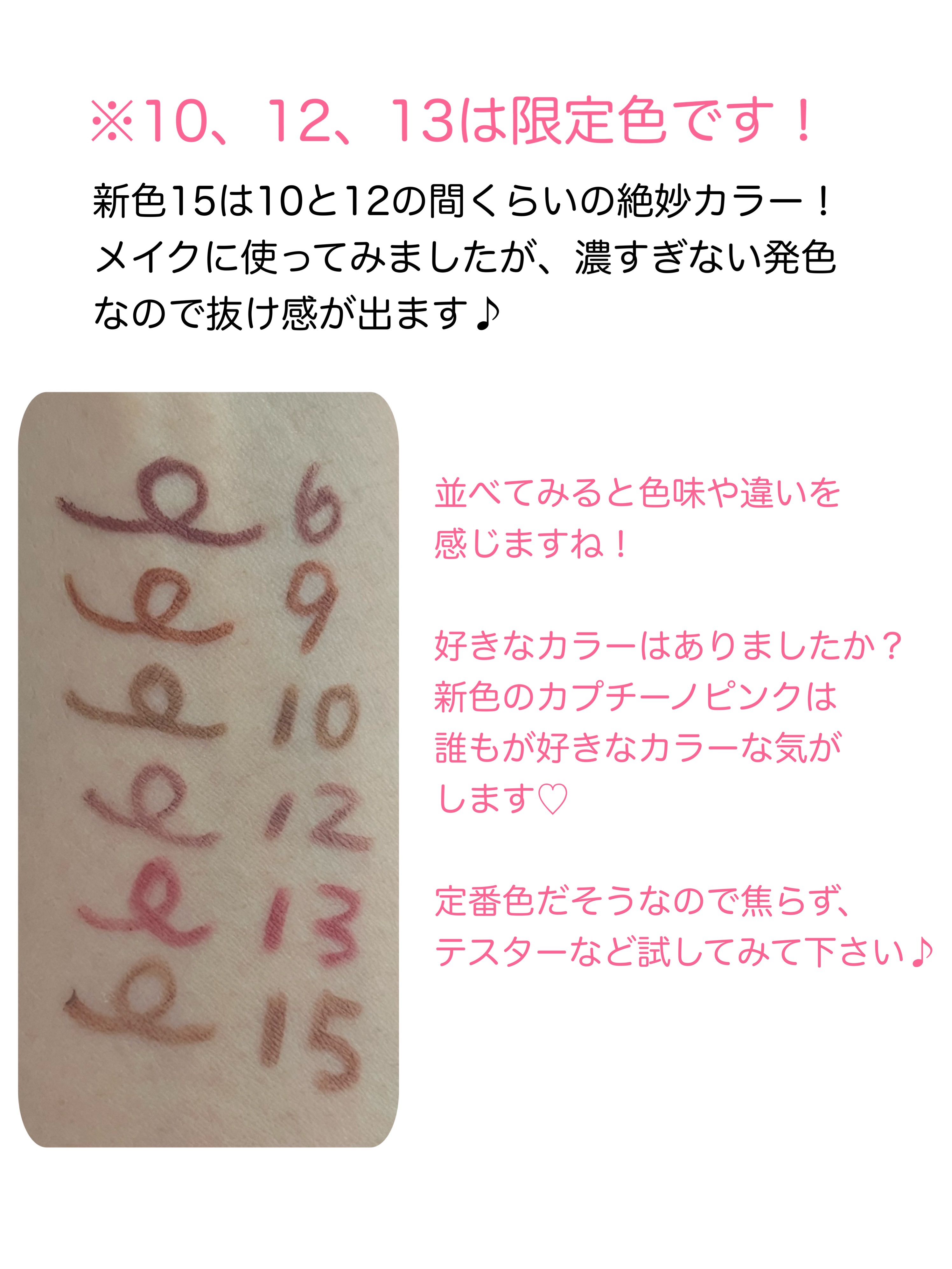 個人的には12イチゴストームが気に入りました! 今日も使いましたが、濃過ぎないので抜け感が出せます。 ハッキリしない色で、抜け感とオシャレ感を出したいならこの色がオススメかな♡ 私はイエベ秋ですが、深みのある色やバーガンディが好きなのでそっちよりの色味が多い気がします。