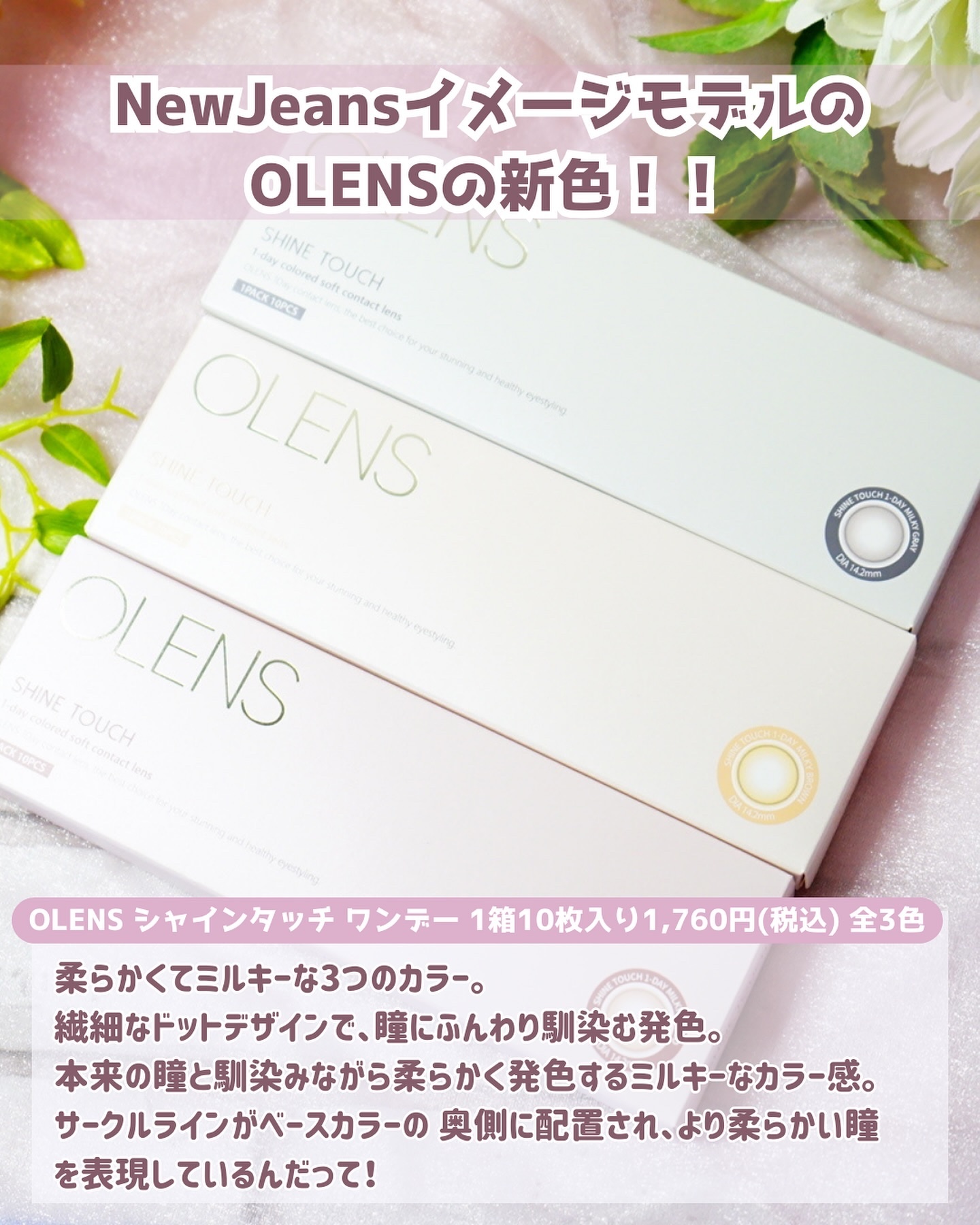 - ■OLENS ShineTouch(オーレンズシャインタッチ) 韓国カラコン業界の人気ブランド『OLENS(オーレンズ)』の日本正式承認商品シリーズ。ふんわりミルキーなカラーとほんのりした細フチとベースカラーの奥側にサークルラインを配置されたデザイン。“柔らかくてミルキーなカラー感”のあるナチュラルな瞳を表現。世界中から注目を浴びるグループ「NewJeans (ニュージーンズ)」がイメージモデル。流行、季節に問わずデイリーで着用できるカラコン「シャインタッチ」シリーズがついに日本で新発売!本来の瞳と馴染みやすいのでデイリーで着用しやすいシリーズです。 発売開始日:2024年4月19日 モアコンタクトで発売 ■使い方 コンタクトレンズは高度管理医療機器です。必ず眼科医の処方に従って購入してください。 ■使用上の留意事項 コンタクトレンズは高度管理医療機器です。眼科医の指導に従い装用期間を厳守し、正しくお使いください。眼の定期検査を必ず受けてください。添付文書を必ず読み、取扱方法、装用時間を守って正しくお使いください。少しでも異常を感じたら、直ちに眼科医の検査を受けてください。