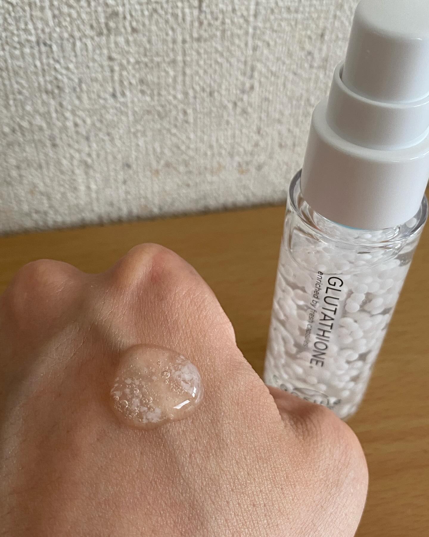 - ①はじける白玉!注目の"グルタチオン"*1をカプセルに厳選配合 ②新鮮なグルタチオンが肌に浸透*2 ③グルタチオン×2種のビタミンC誘導体*3が総合的にアプローチ ④コラーゲン、ヒアルロン酸、3種類のセラミド、ナイアシンアミド、ツボクサエキス(CICA)、フラーレン等11種類の整肌成分を同時に配合 ⑤肌なじみのよい使い心地 ⑤毛穴*4、ざらつき*5、くすみ*5・透明感5、キメ・ツヤもコレ1つで。4in1美容液。 はじけて生まれる生美容液。-独自カプセルが、成分本来のチカラをサポートするこだわりの美容液- *1グルタチオン(皮膚コンディショニング剤) *2角質層まで *3パルミチン酸アスコルビルリン酸3Na、3-グリセリルアスコルビン酸(酸化防止剤) *4乾燥による毛穴の開き *5乾燥による