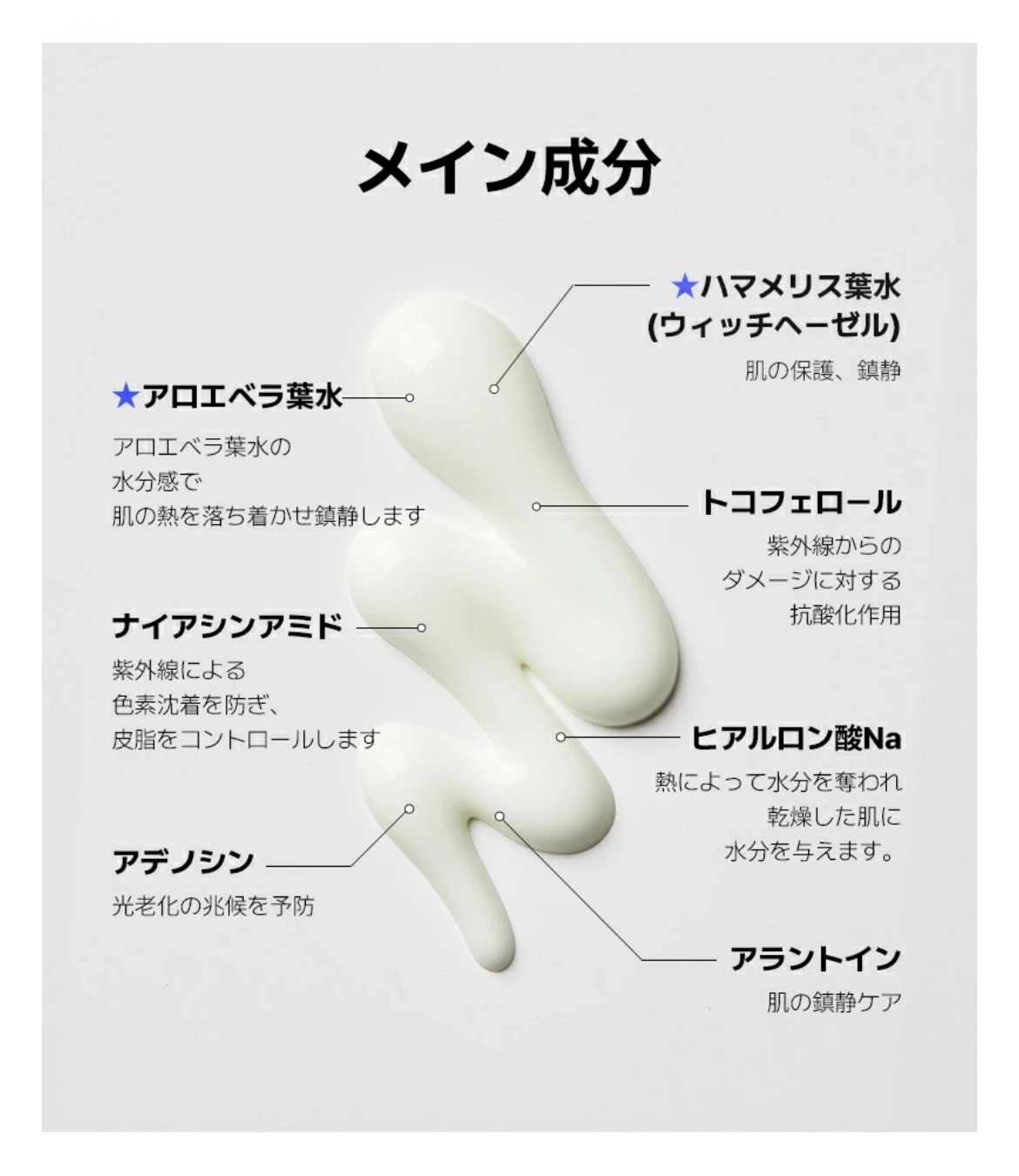 - <ウルトラライト透明UVクリーム> アロエベラ葉水、コハク酸ジエチルヘキシル、プロパンジオール、水、ドロメトリゾールトリシロキサン、エチルヘキシルトリアゾン、ナイアシンアミド、ジエチルアミノヒドロキシベンゾイル安息香酸ヘキシル、テレフタリリデンジカンフルスルホン酸、1,2-ヘキサンジオール、ベヘニルアルコール、メチルトリメチコン、ポリアクリロイルジメチルタウリンNa、ハマメリス葉水、トロメタミン、ポリアクリレートクロスポリマー-6、アラキジルアルコール、カプリリルグリコール、エチルヘキシルグリセリン、アラキジルグルコシド(アラキルグルコシド)、メタリン酸Na、アデノシン、トコフェロール、ヒアルロン酸Na、アラントイン、クエン酸、安息香酸Na、ソルビン酸K