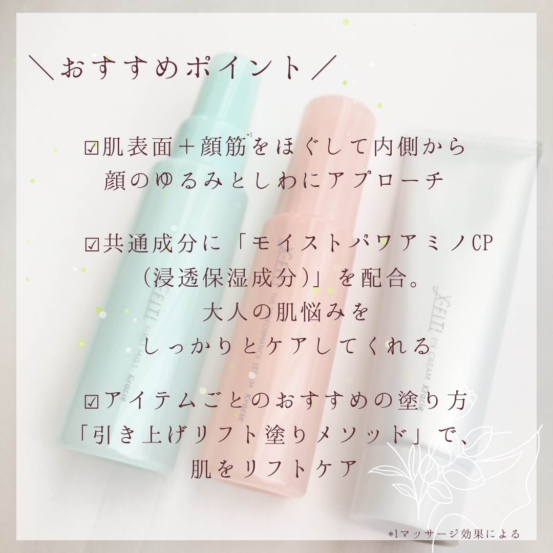 ミストを顔全体にスプレーしてからセラムでフェイスラインをシュッと引き上げてくれます✨ セラムはみずみずしいテクスチャーでツヤツヤになります! フェイスクリームはこってりしてて潤い感を感じるのでとても良いです!