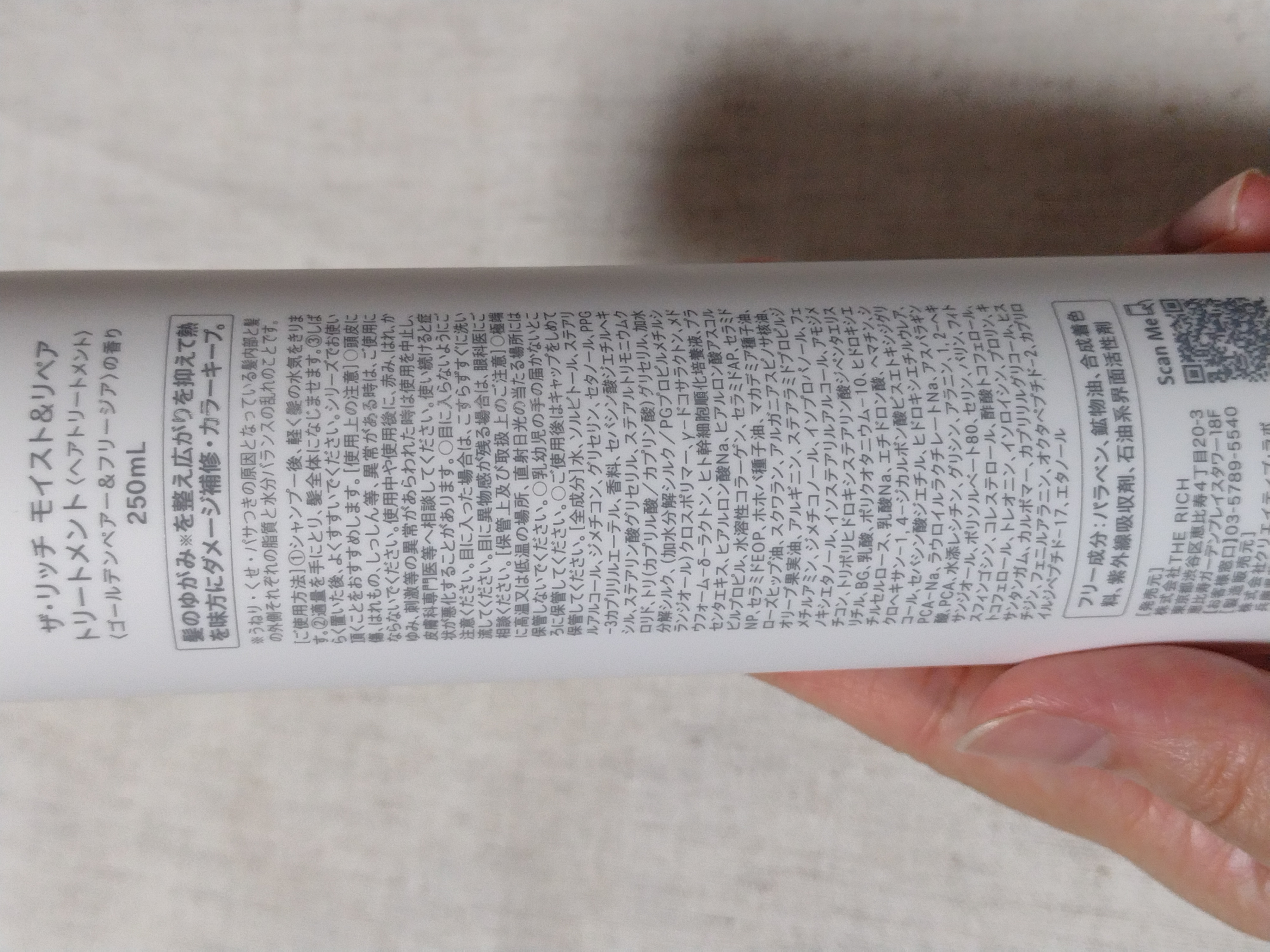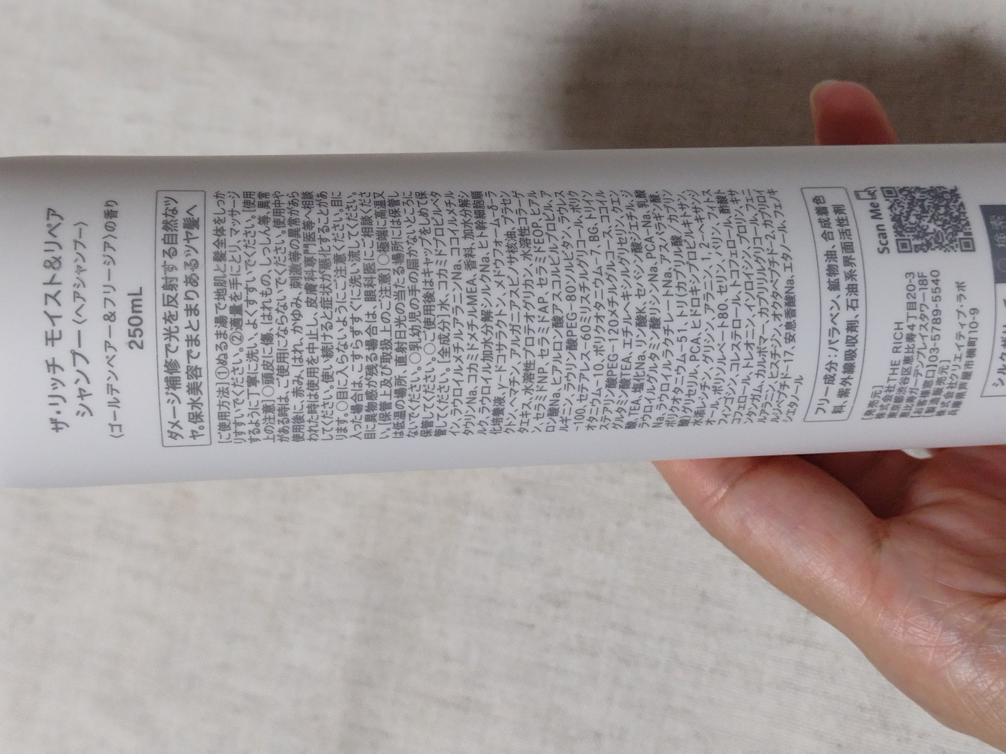 - <シャンプー(250ml)> 水、コカミドプロピルベタイン、ラウロイルメチルアラニンNa、ココイルメチルタウリンNa、コカミドメチルMEA、香料、加水分解シルク、ラウロイル加水分解シルクNa、ヒト幹細胞順化培養液、γ-ドコサラクトン、メドウフォーム-δ-ラクトン、ヘマチン、アルガニアスピノサ核油、プラセンタエキス、水溶性プロテオグリカン、水溶性コラーゲン、セラミドNP、セラミドAP、セラミドEOP、ヒアルロン酸Na、ヒアルロン酸アスコルビルプロピル、アルギニン、ラウリン酸PEG-80ソルビタン、ラウレス-100、セテアレス-60ミリスチルグリコール、ポリクオタニウム-10、ポリクオタニウム-7、BG、トリイソステアリン酸PEG-120メチルグルコース、ココイルグルタミン酸TEA、エチルヘキシルグリセリン、クエン酸、TEA、塩化Na、リン酸K、セバシン酸ジエチル、ジラウロイルグルタミン酸リシンNa、PCA-Na、乳酸Na、ラウロイルラクチレートNa、アスパラギン酸、ポリクオタニウム-51、トリ(カプリル酸/カプリン酸)グリセリル、PCA、ヒドロキシプロピルキトサン、水添レシチン、グリシン、アラニン、1,2 -ヘキサンジオール、ポリソルベート80、セリン、バリン、フィトスフィンゴシン、コレステロール、トコフェロール、酢酸トコフェロール、トレオニン、イソロイシン、プロリン、キサンタンガム、カルボマー、カプリリルグリコール、フェニルアラニン、ヒスチジン、オクタペプチド-2、カプリロイルジペプチド-17、安息香酸Na、エタノール、フェノキシエタノール <トリートメント(250ml)> 水、ソルビトール、ステアリルアルコール、ジメチコン、グリセリン、セタノール、PPG-3カプリリルエーテル、香料、セバシン酸ジエチルヘキシル、ステアリン酸グリセリル、ステアルトリモニウムクロリド、トリ(カプリル酸/カプリン酸)グリセリル、加水分解シルク、(加水分解シルク/PGプロピルメチルシランジオール)クロスポリマー、γ-ドコサラクトン、メドウフォーム-δ-ラクトン、ヒト幹細胞順化培養液、プラセンタエキス、ヒアルロン酸Na、ヒアルロン酸アスコルビルプロピル、水溶性コラーゲン、セラミドAP、セラミドNP、セラミドEOP、ホホバ種子油、マカデミア種子油、ローズヒップ油、スクワラン、アルガニアスピノサ核油、オリーブ果実油、アルギニン、ステアラミドプロピルジメチルアミン、ジメチコノール、イソプロパノール、フェノキシエタノール、イソステアリルアルコール、アモジメチコン、トリポリヒドロキシステアリン酸ジペンタエリスリチル、BG、乳酸、ポリクオタニウム-10、ヒドロキシエチルセルロース、乳酸Na、エチドロン酸、ヘマチン、シクロヘキサン-1,4-ジカルボン酸ビスエトキシジグリコール、セバシン酸ジエチル、ヒドロキシエチルウレア、PCA-Na、ラウロイルラクチレートNa、アスパラギン酸、PCA、水添レシチン、グリシン、アラニン、1,2-ヘキサンジオール、ポリソルベート80、セリン、バリン、フィトスフィンゴシン、コレステロール、酢酸トコフェロール、トコフェロール、トレオニン、イソロイシン、プロリン、キサンタンガム、カルボマー、カプリリルグリコール、ヒスチジン、フェニルアラニン、オクタペプチド-2、カプリロイルジペプチド-17、エタノール