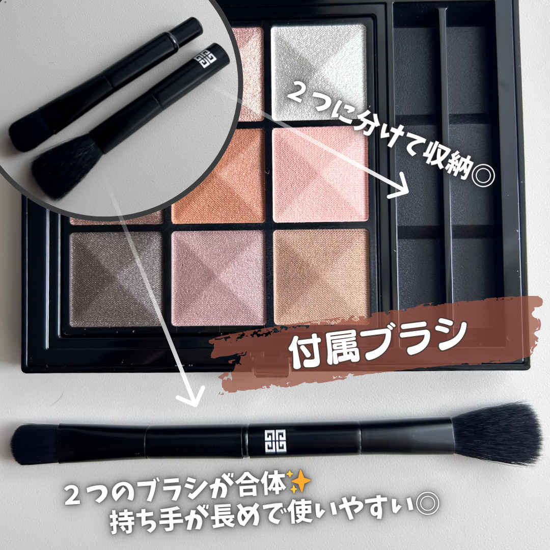 - ジバンシイが選び抜いた、9色ミックスの新アイシャドウ。 フランス語で数字の『9』を表す “neuf(ヌフ)” の言葉のとおり、マット、サテン、グリッター、メタリックの4種のテクスチュアからなる9色で構成されています。塗布すると肌に吸い付くようになじむテクスチュア。ロングラスティングで、メイク直後の美しい仕上がりが、長時間持続します。2種類のブラシをセットできるアプリケーター付き。